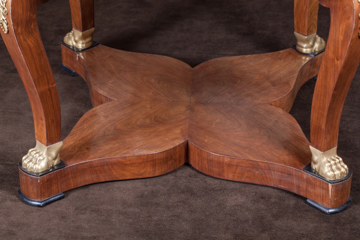 Grand GUÉRIDON en placage de noyer à quatre montants en console à griffes de lion, palmettes et couronnes de laurier en bronze doré (rapportés). Entretoise socle quadrilobée échancrée à accolades. Dessus de marbre bleu turquin.