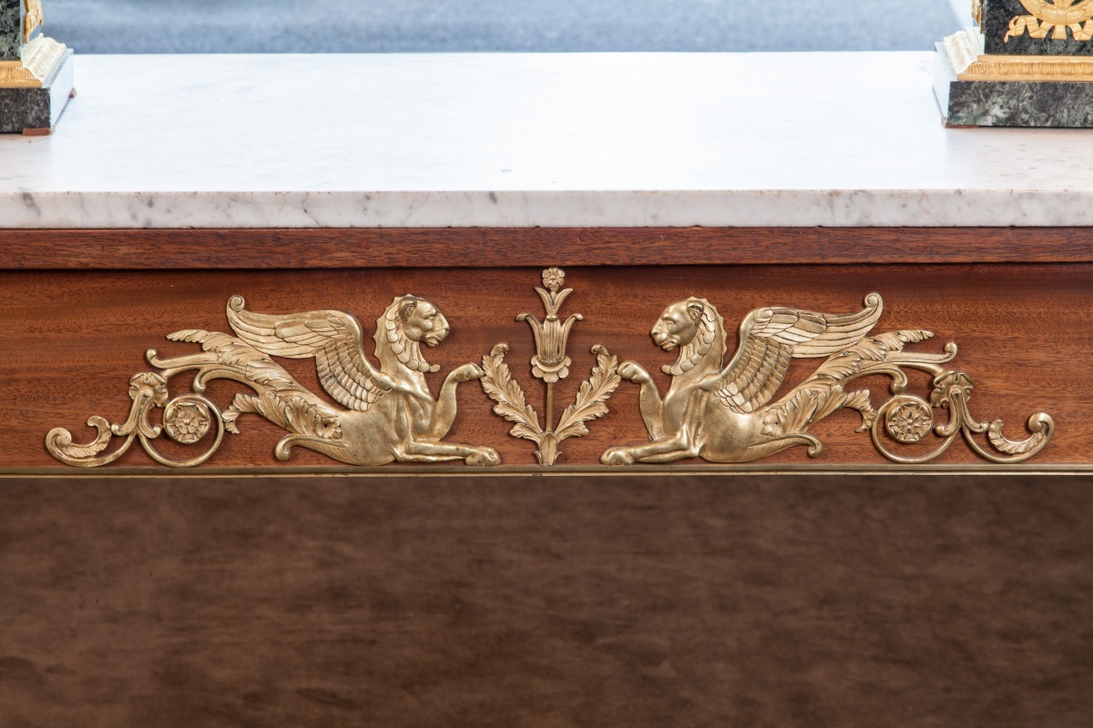 CONSOLE d'APPLIQUE rectangulaire ouvrant à un tiroir en placage d'acajou. Montants antérieurs en forme de femme antique en bronze doré et bronze patiné. Montants arrières en pilastre et fond de glace sur une base socle échancrée. Ornementation de bronzes dorés: lions ailés et fleurs. Dessus de marbre blanc veiné.
