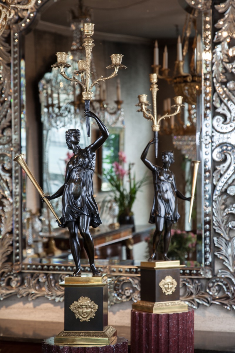 PAIRE de CANDÉLABRES en bronze patiné et bronze doré ornés d'une figure de Renommée tenant une trompette et un bouquet de quatre lumières. Socles ornés d'un mascaron et de feuilles d'acanthe.
