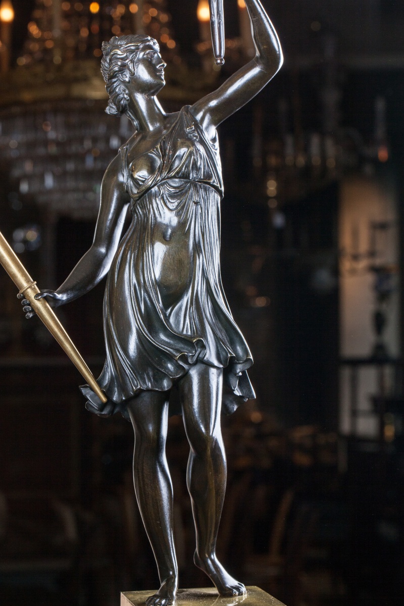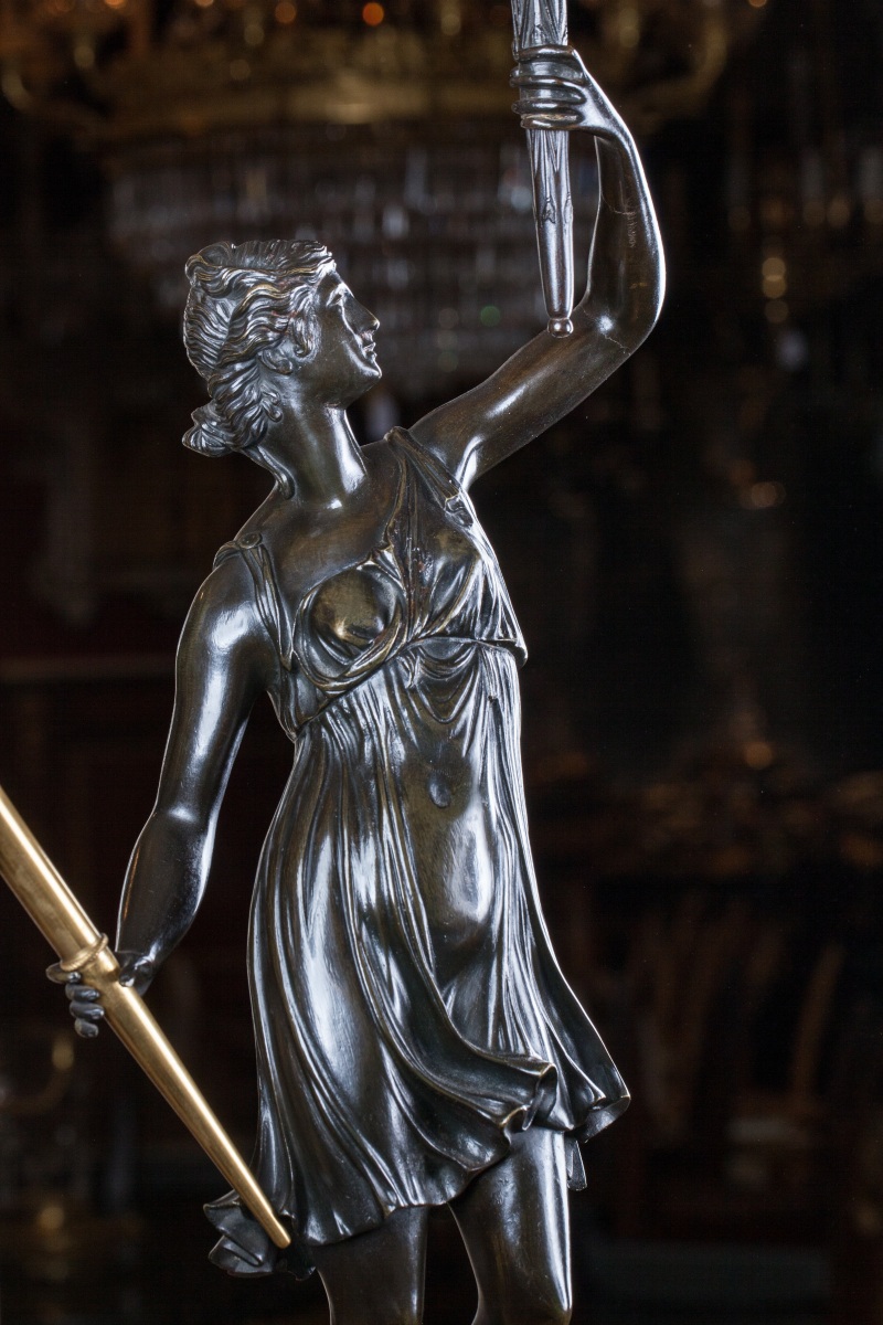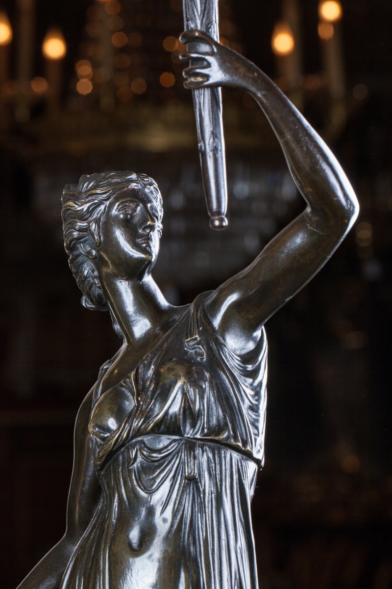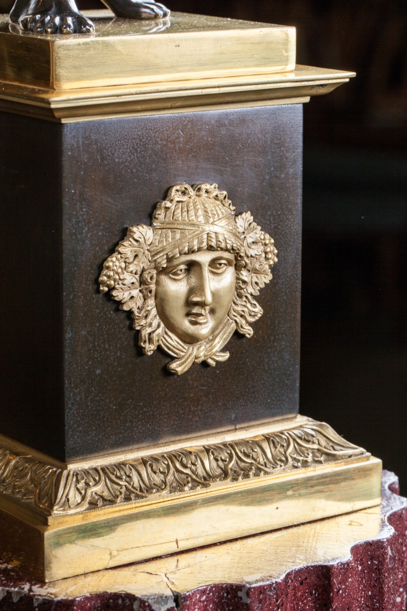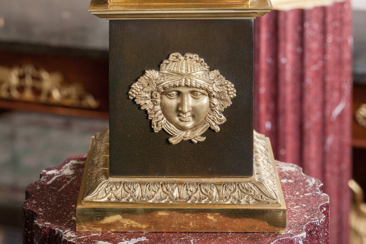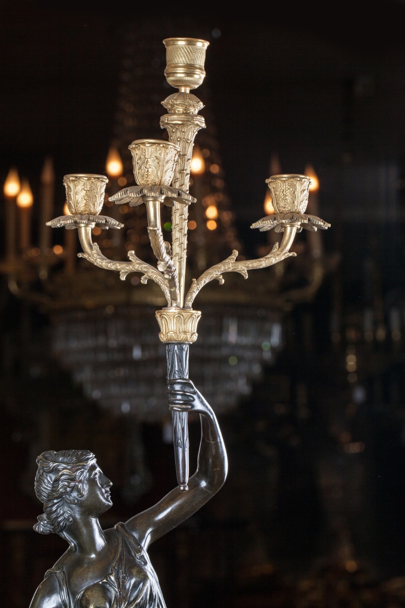 On trouve des figures semblables sur des candélabres livrés par Galle pour le salon de l'Impératrice au Palais de Fontainebleau en 1807 (F 3851), et par Feuchère pour le château de Compiègne en 1810.