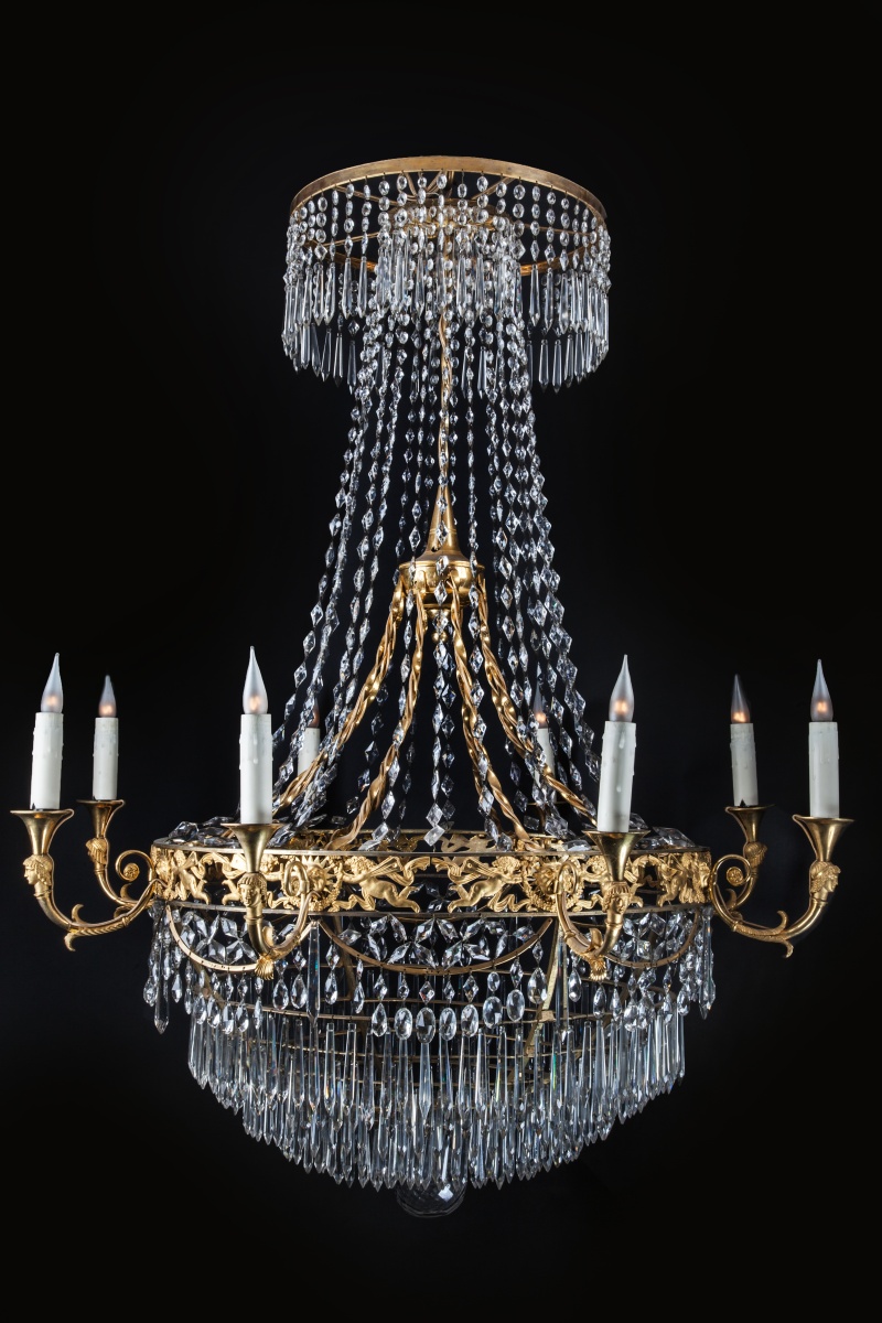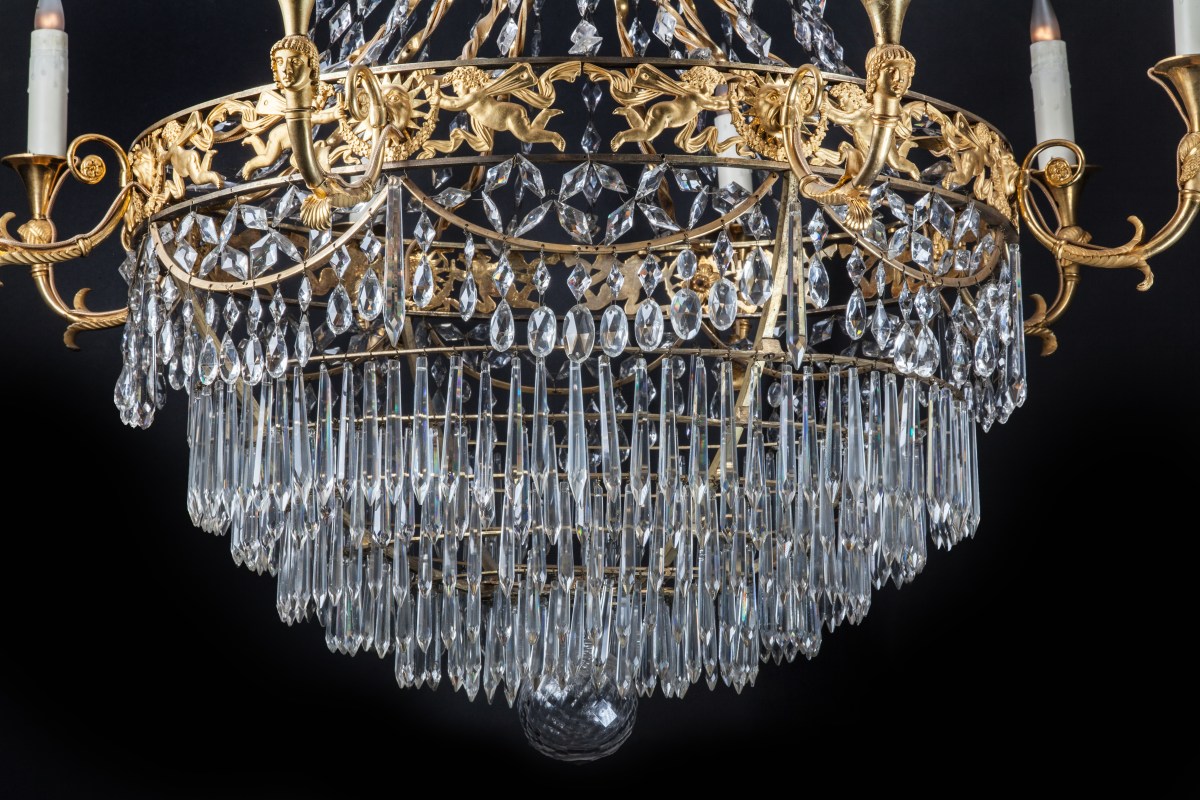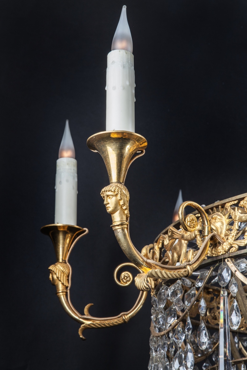 LUSTRE corbeille à six lumières à têtes de personnages à couronne ajourée décorée d'une course de zéphyrs, soleils rayonnants et guirlandes. Ornementation d'olives et pampilles de cristal taillé.