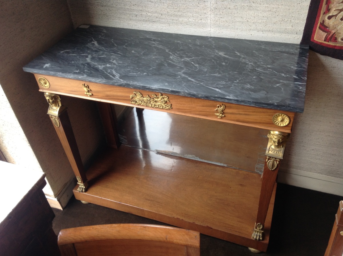CONSOLE rectangulaire en acajou et placage d'acajou. Montants antérieurs en bustes d'égyptiennes ailées, en gaine, en bronze doré et griffes de lion. Montants arrières en pilastre à fond de glace. Pieds galettes en bronze. Dessus de marbre bleu turquin.