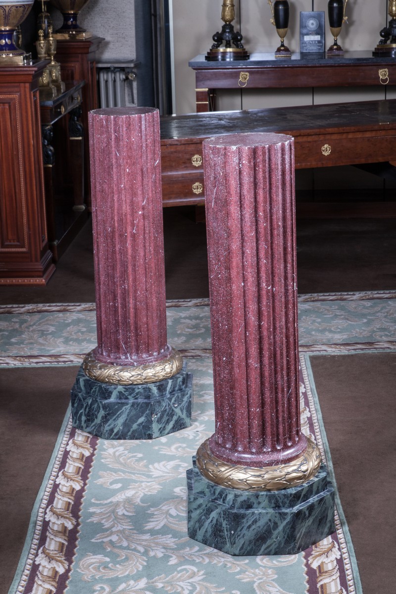PAIRE de COLONNES cannelées en bois sculpté peintes à l'imitation du porphyre. Bases à tors de laurier sur un socle octogonal en marbre vert de mer simulé.