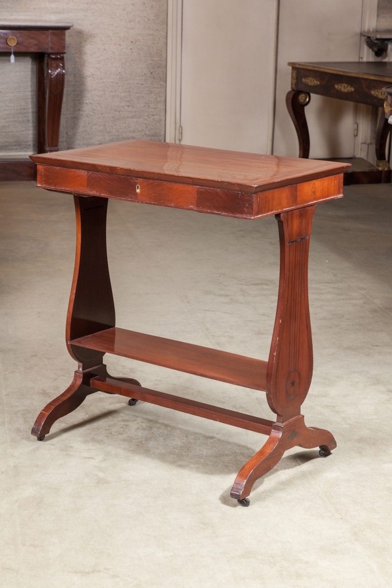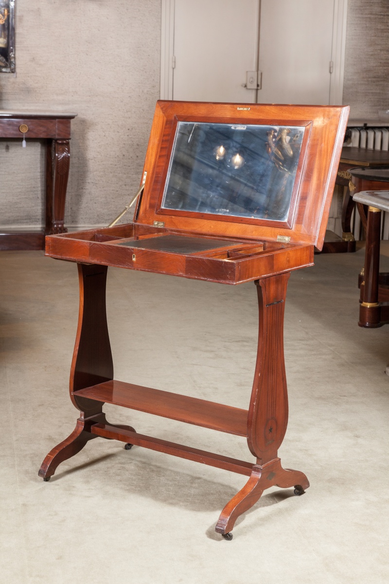 TABLE VIDE-POCHES en acajou, placage d'acajou et incrustations d'ébène. Plateau ouvrant à glace découvrant une tablette écritoire et six casiers. Deux montants en forme de lyre sur patins à roulettes, réunis par une tablette d'entretoise.