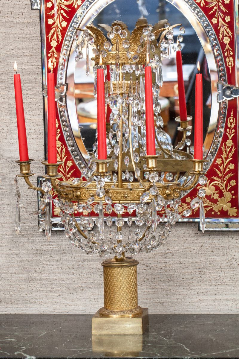 PAIRE de GIRANDOLES en demi-lustre corbeille en bronze doré à cinq lumières en corne d'abondance. Fût cannelé torsadé décoré à la molette.