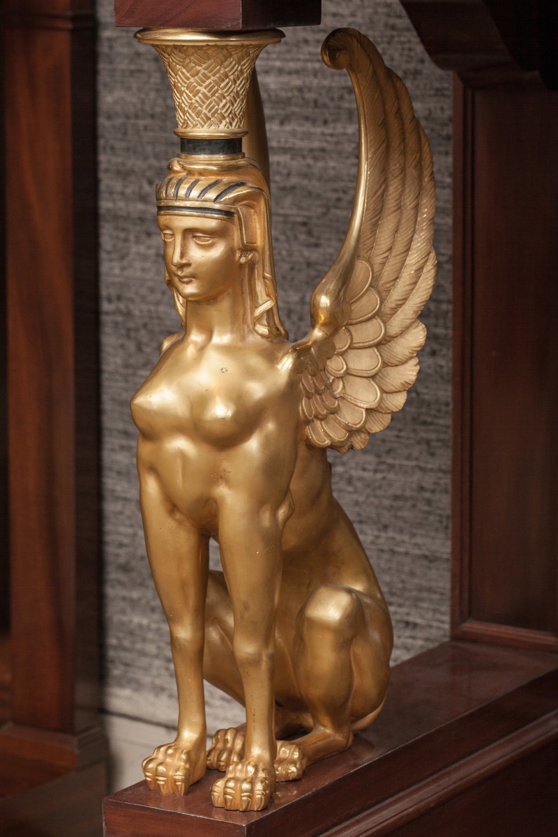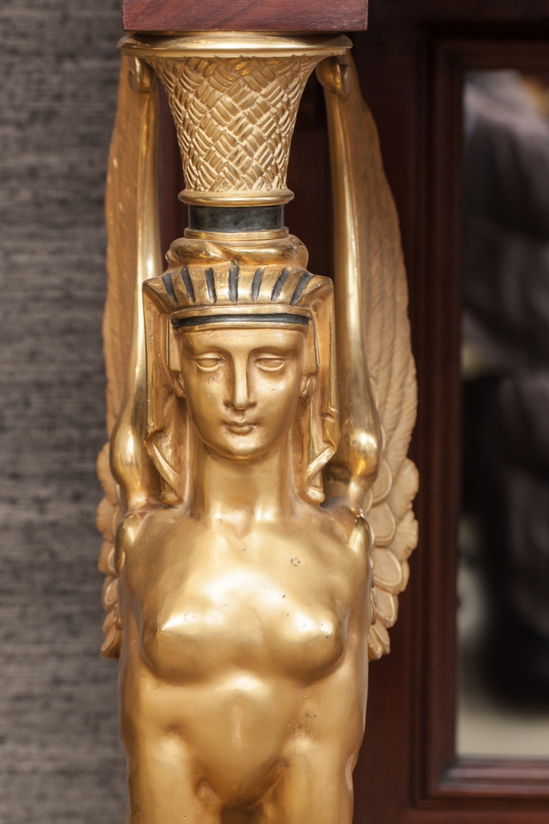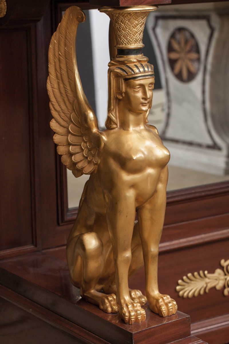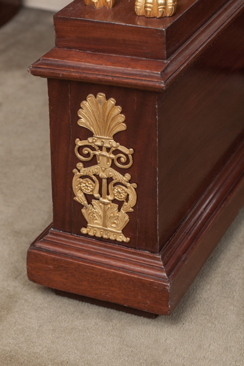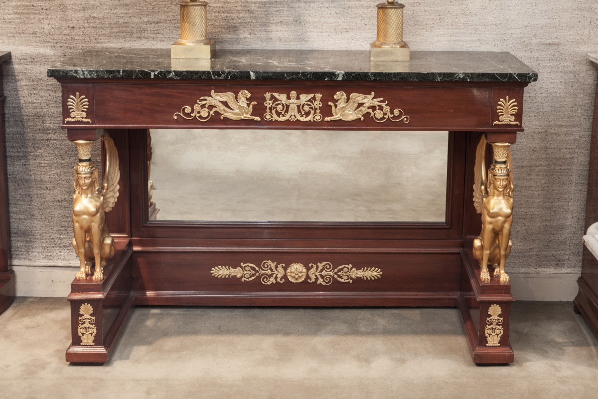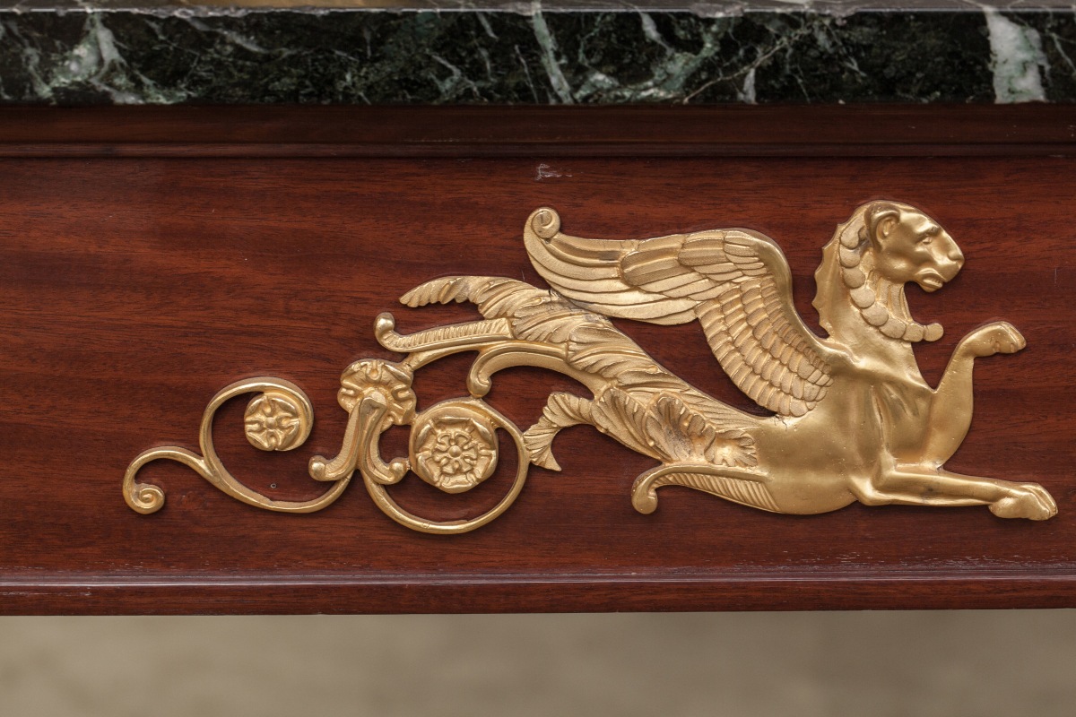 CONSOLE d'APPLIQUE rectangulaire en placage d'acajou. Montants antérieurs en bronze doré en forme de sphinges ailées assises reposant sur des stylobates. Fond de glace sur une base à plinthe. Ornementation de bronzes dorés: lions ailés, feuilles de lotus, torches et volutes. Dessus de marbre vert de mer (réparé).