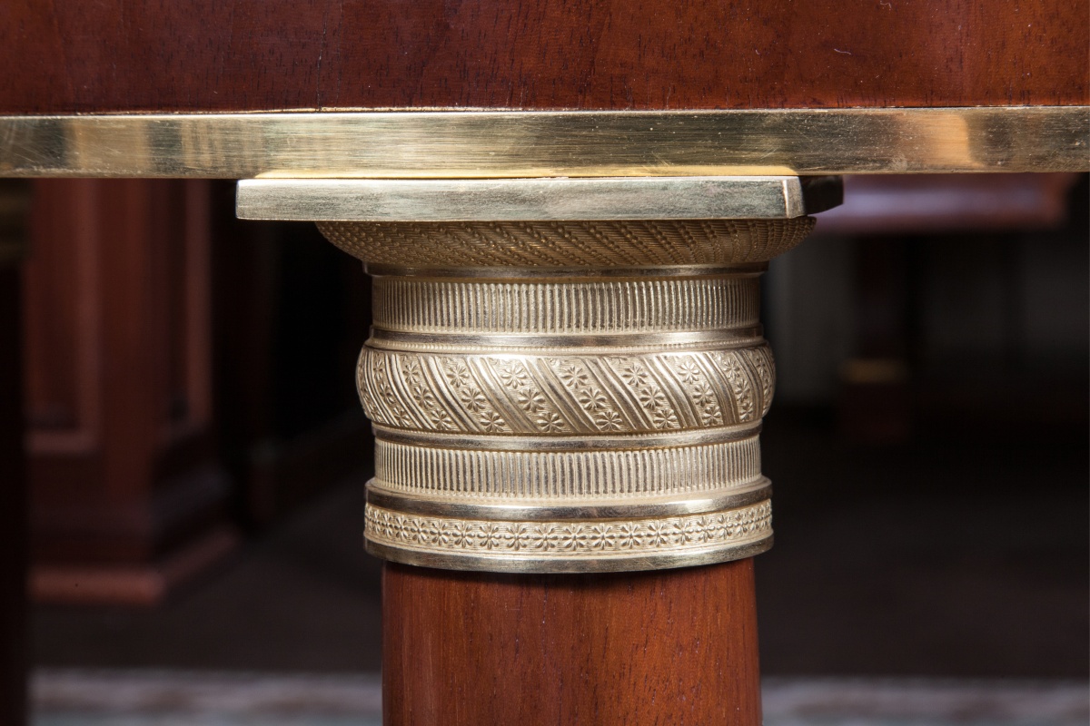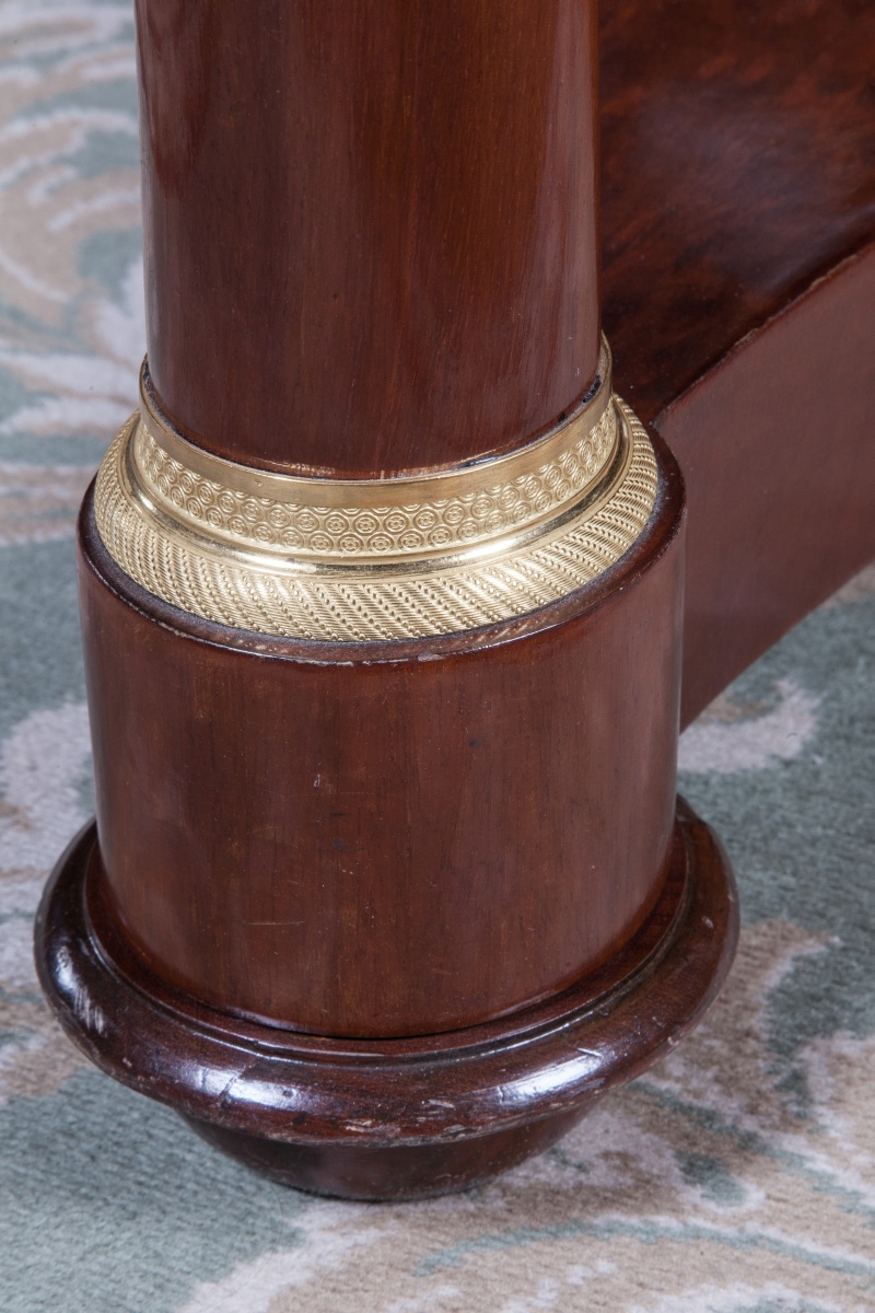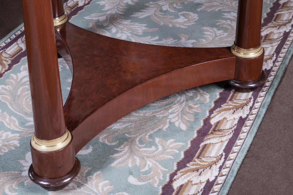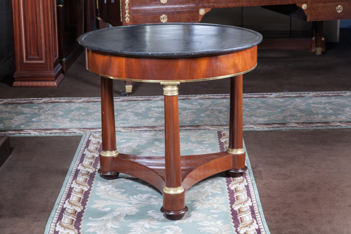 GUÉRIDON en acajou et placage d'acajou moucheté à trois montants en colonne à bagues et chapiteaux de bronze doré décoré à la molette. Entretoise-socle échancré. Dessus de granit noir de Belgique à cuvette.