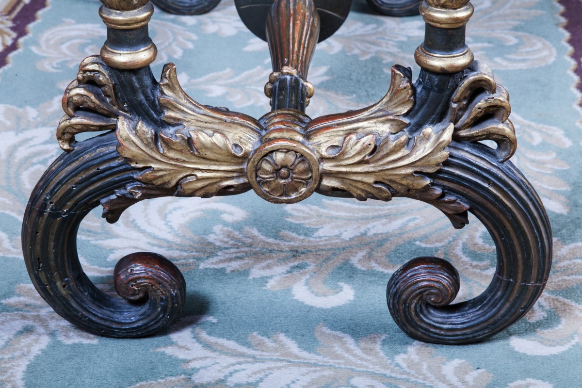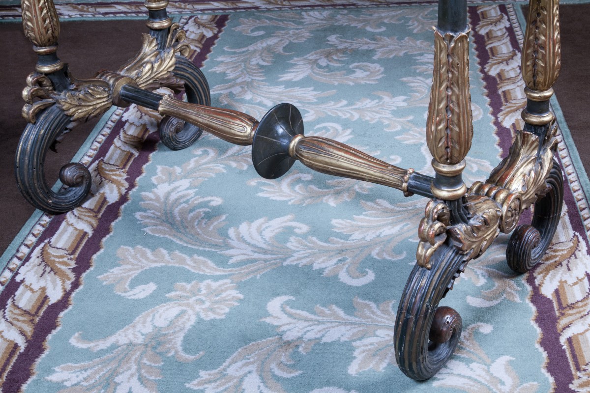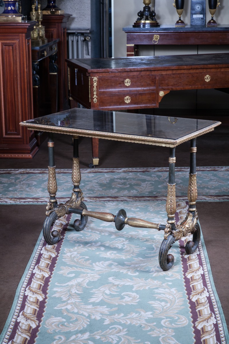 TABLE DE SALON rectangulaire en bois mouluré et sculpté, patiné et doré. Quatre montants feuillagés sur un piètement à crosses godronnées et acanthes à entretoise à disques et godrons.