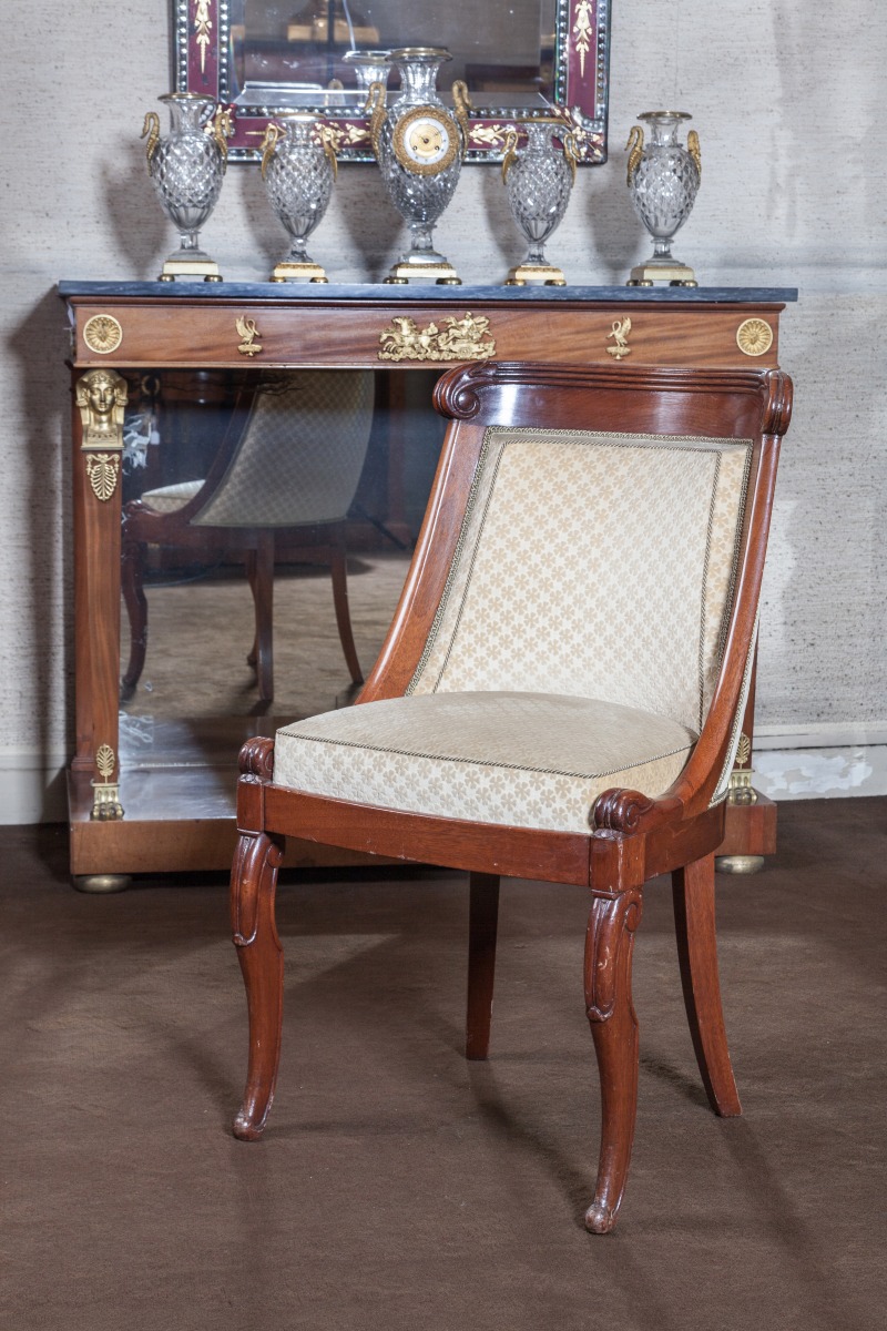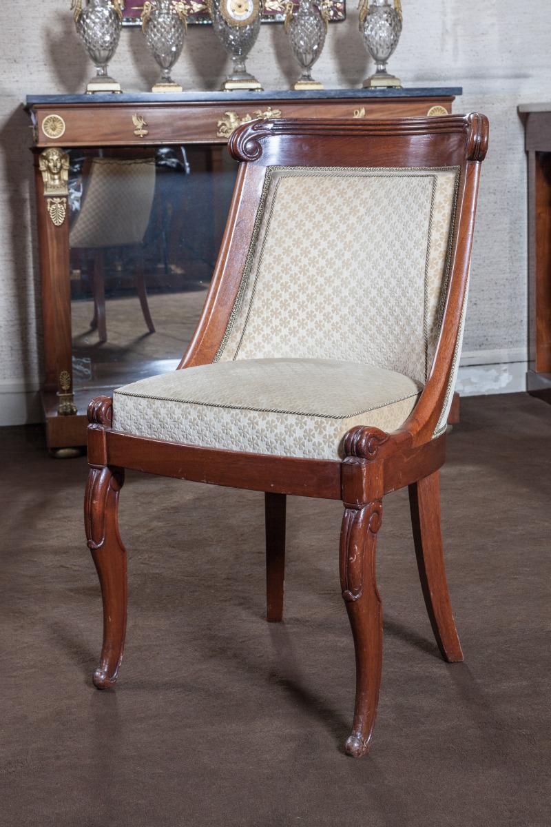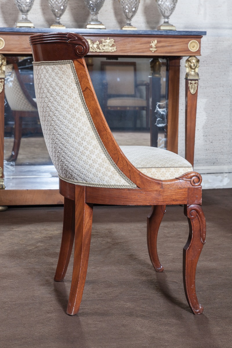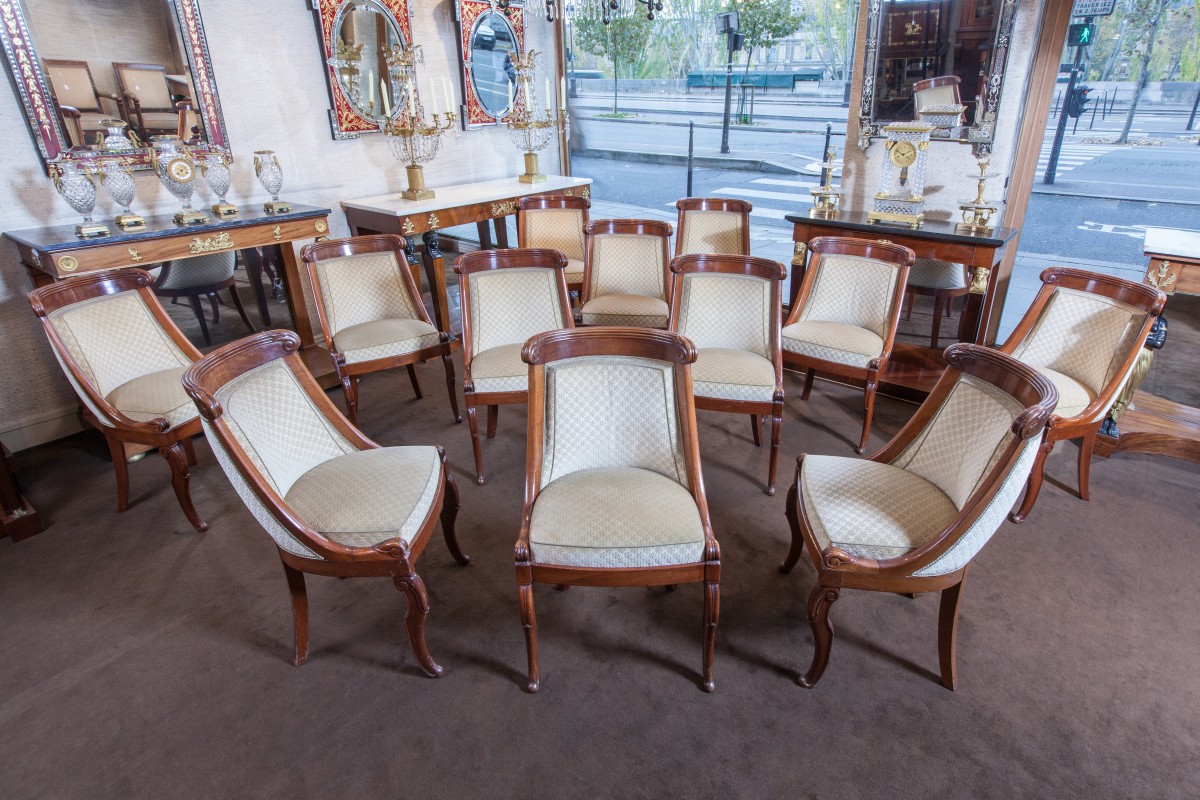 Suite de DOUZE CHAISES GONDOLES à châssis en acajou et placage d'acajou. Dossiers à faisceaux de joncs et crosses en feuilles de lotus. Pieds antérieurs en console à fleurs de lotus, pieds arrières en sabre.