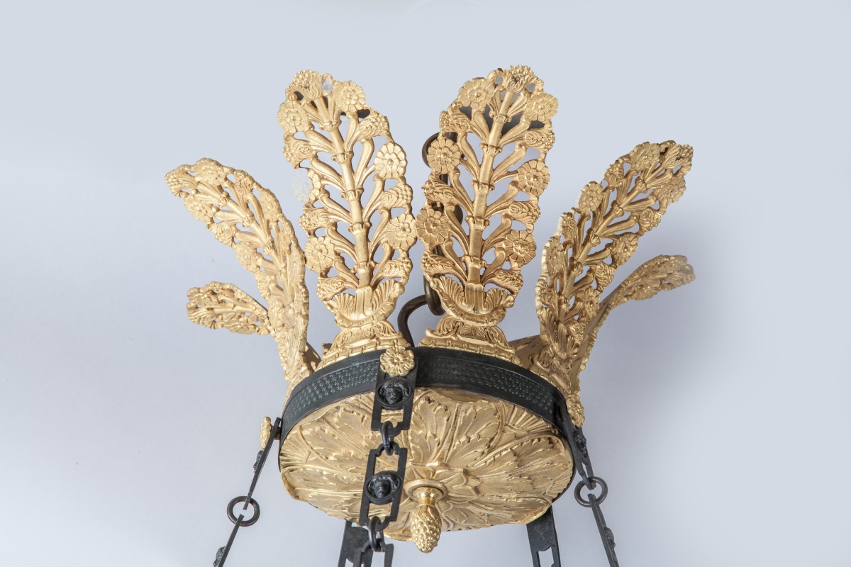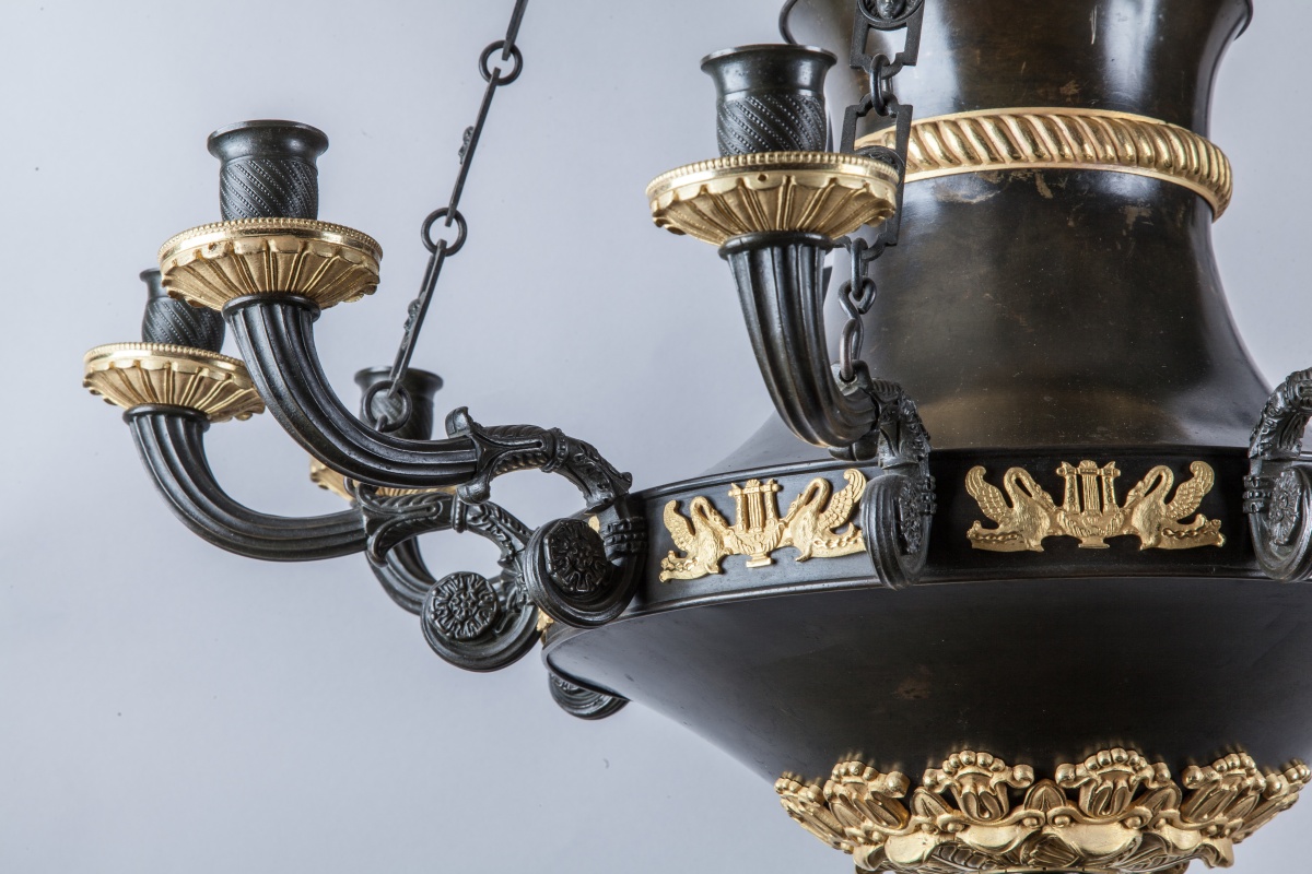 LUSTRE en forme de lampe antique en bronze et tôle patinés et bronze doré à douze lumières. Riche décor doré de palmettes, cygnes, coupe et feuillage.