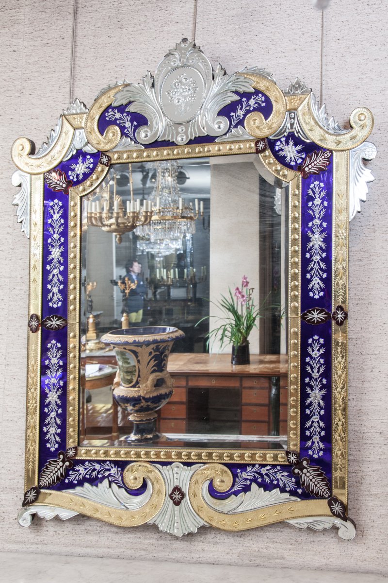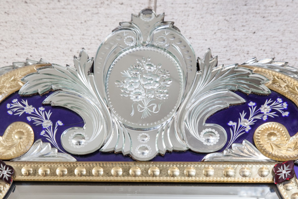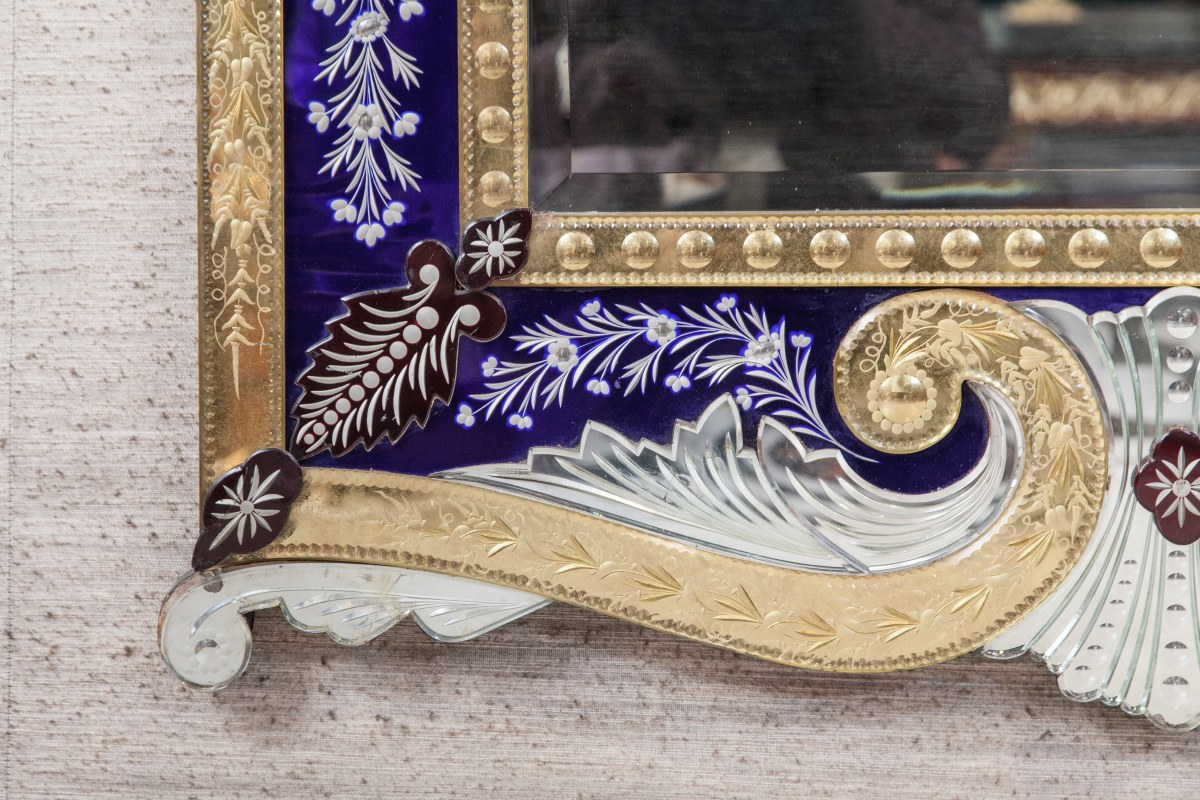 MIROIR "de VENISE" biseauté dans un encadrement en verre cémenté bleu gravé dans une double baguette dorée. Fronton à volutes feuillagées.