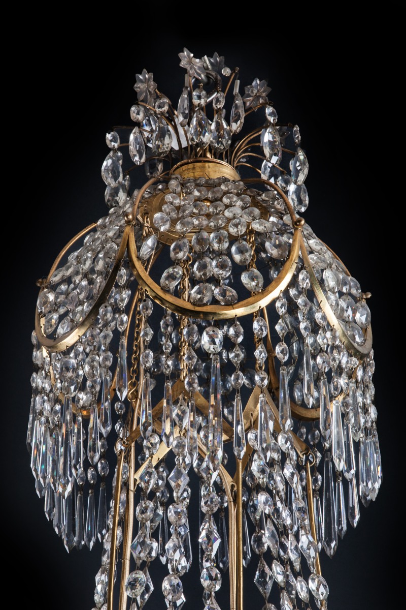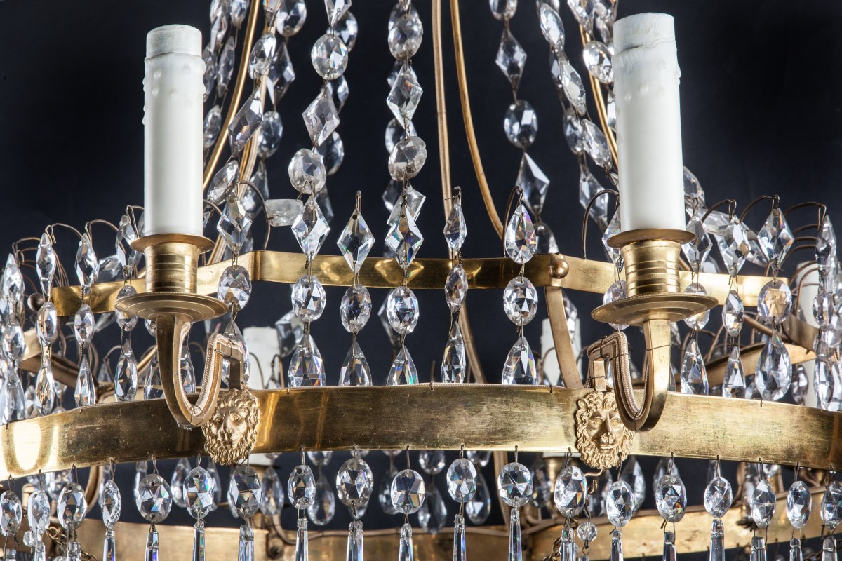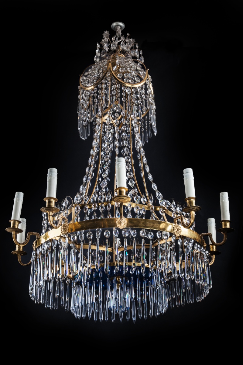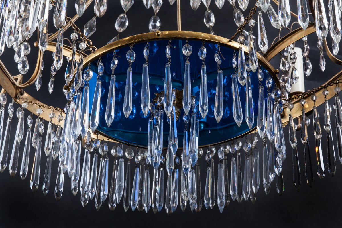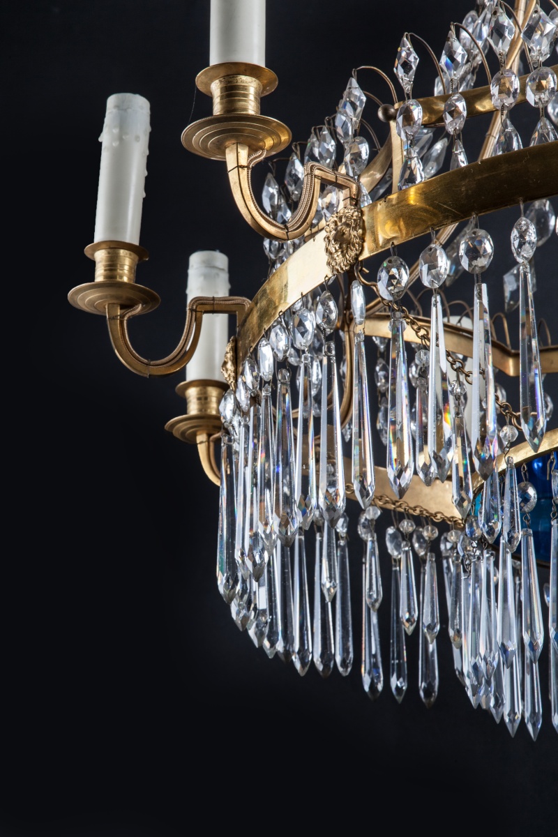 LUSTRE couronne en bronze doré à dix lumières. Couronne centrale à plateau de verre bleu. Ornementation de perles, olives, losanges et pampilles en cristal taillé.