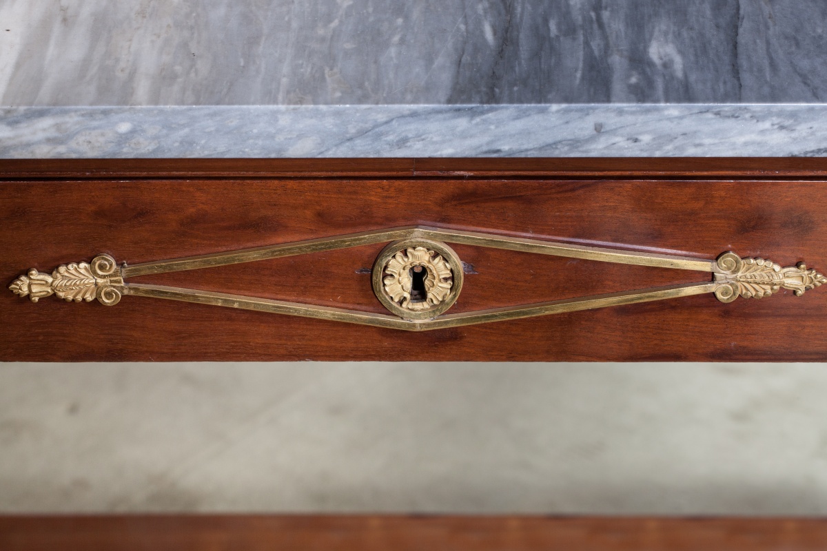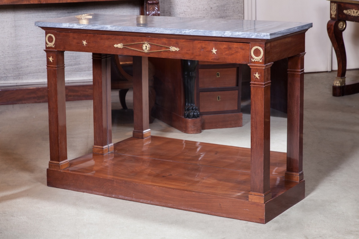 CONSOLE d'APPLIQUE rectangulaire en acajou et placage d'acajou, ouvrant à un tiroir. Montants antérieurs en colonne à section carrée, montants arrières en pilastre encadrant un fond de glace (rapporté). Base socle. Ornementation de bronzes dorés: fleurons, couronnes de fleurs, étoiles et palmettes. Dessus de marbre bleu turquin.