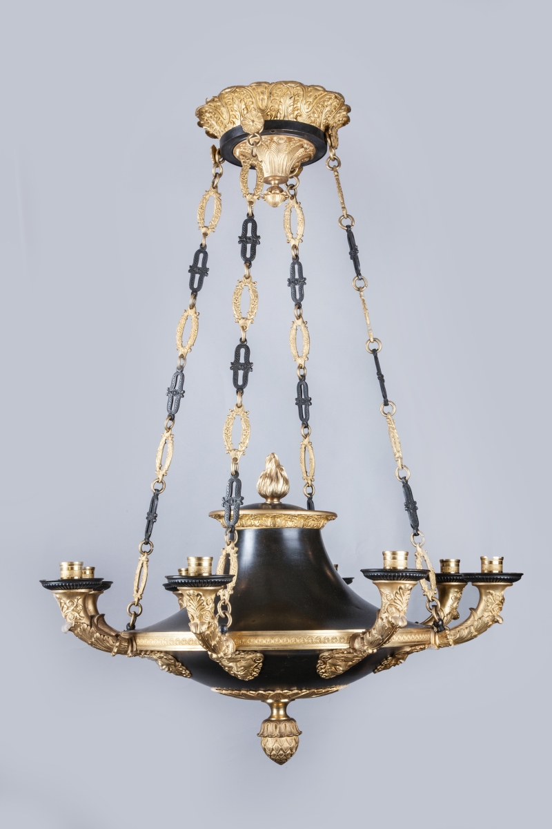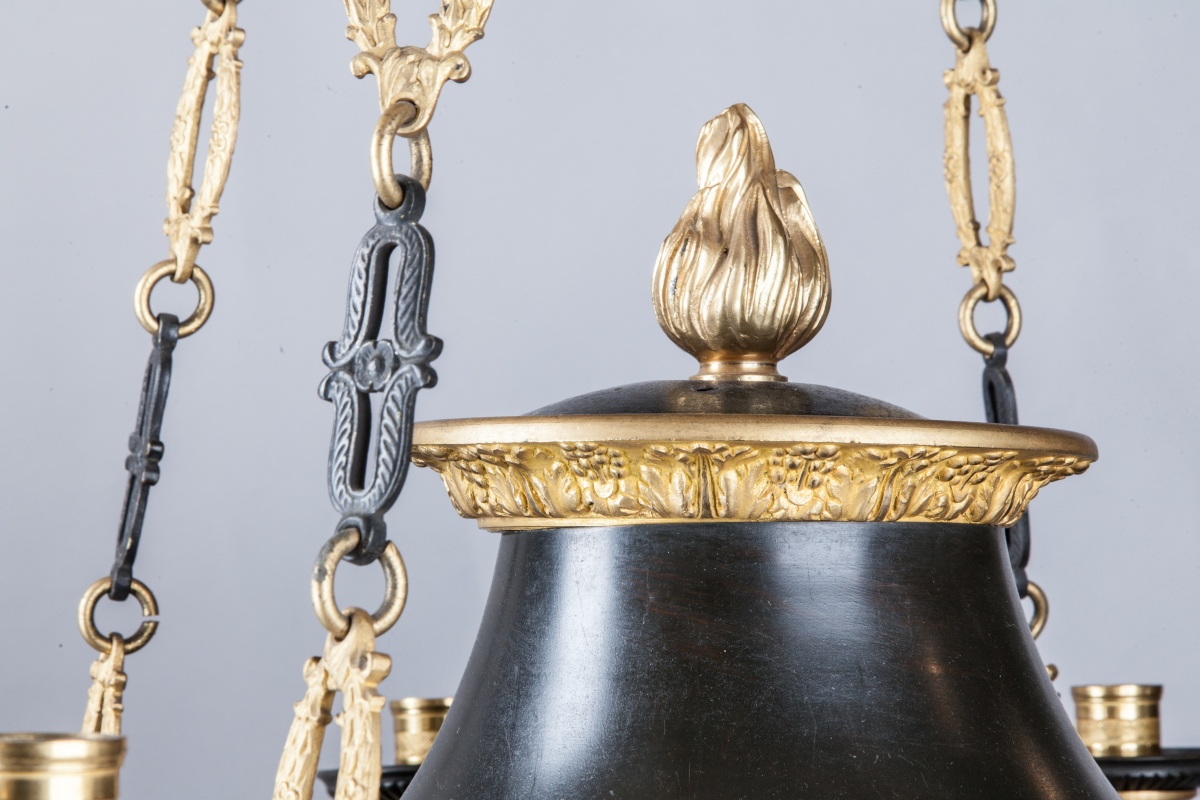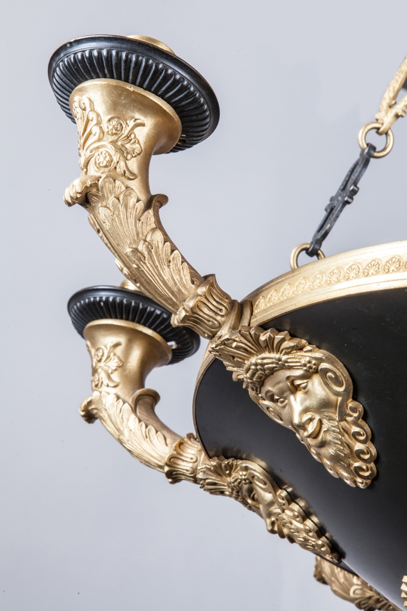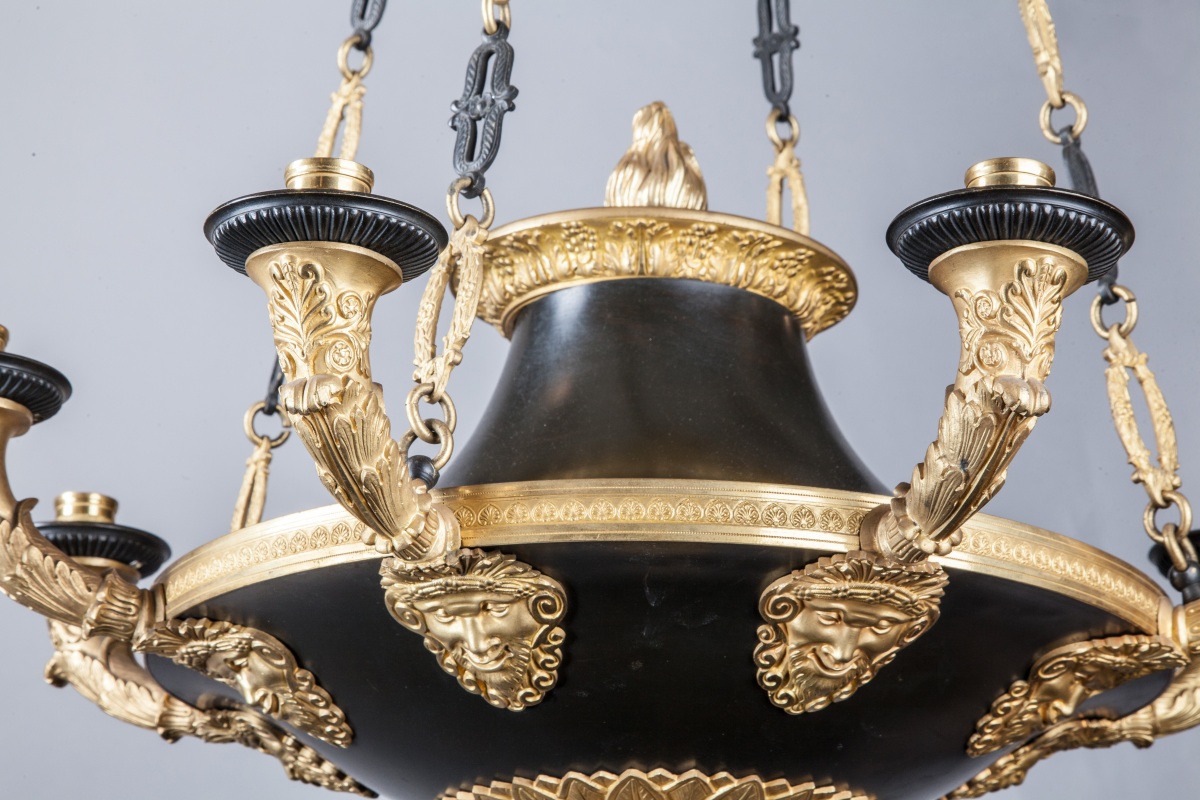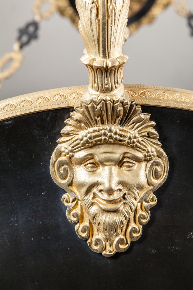 LUSTRE en forme de lampe antique à huit bras de lumière en bronze doré et tôle patinée à décor de têtes de faune, feuilles de laurier, palmettes et feuillages. Quatre chaînes à maillons feuillagés.