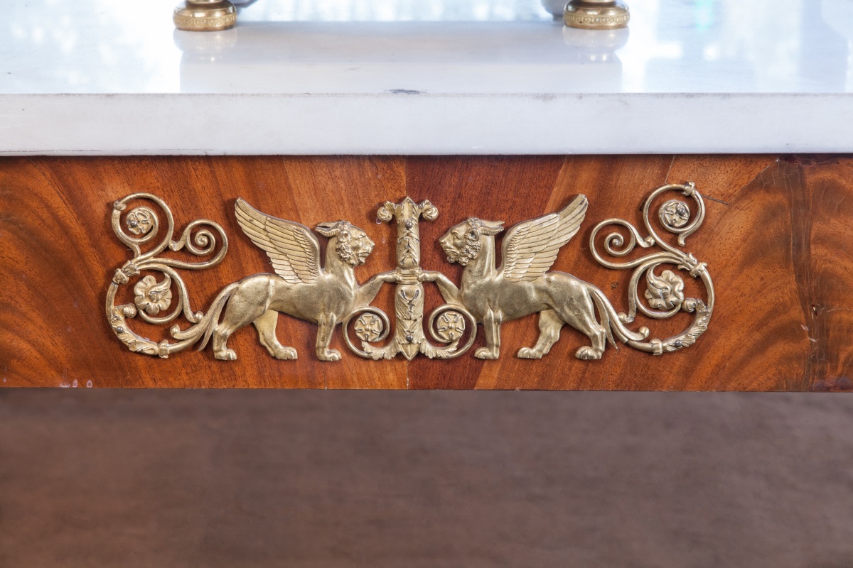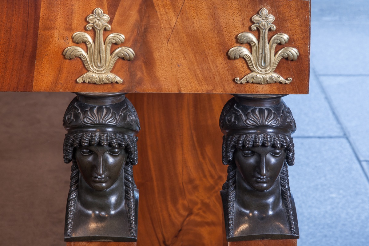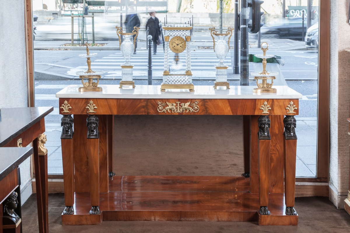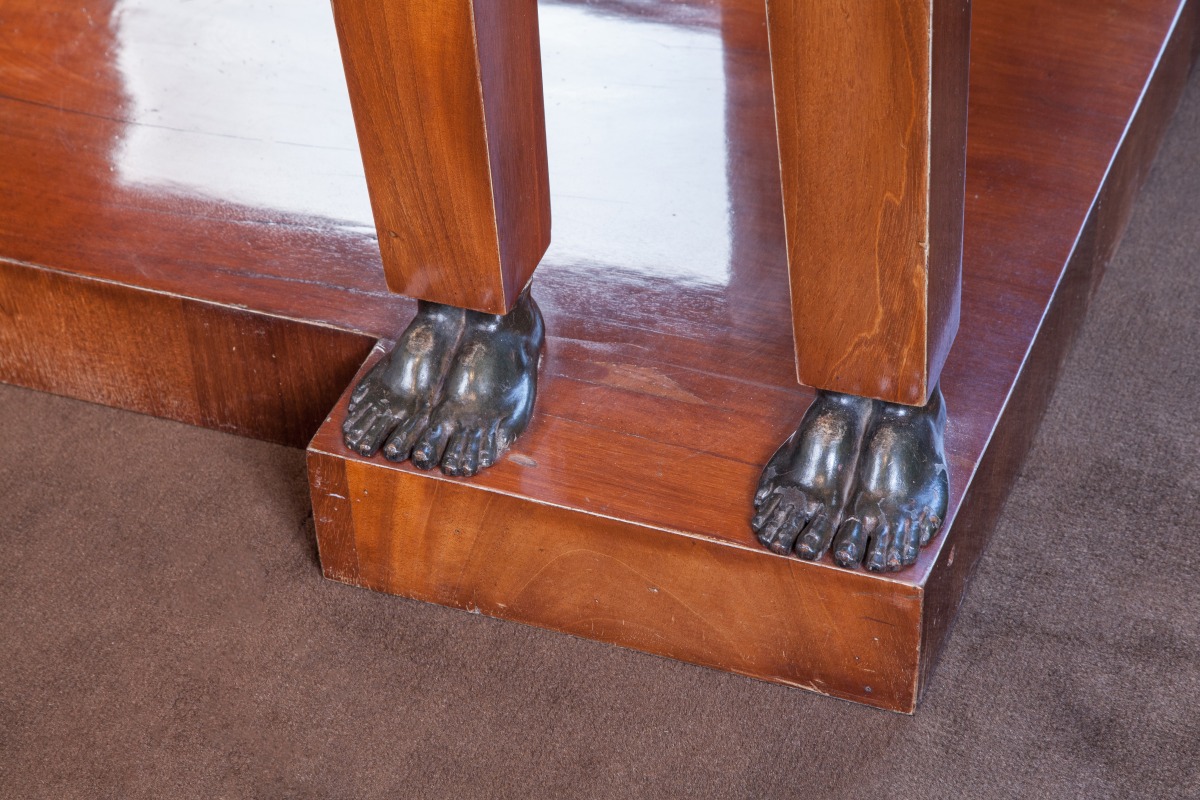 Grande CONSOLE d'APPLIQUE rectangulaire ouvrant à un tiroir en placage d'acajou flammé. Façade à quatre montants à cariatides en gaine à têtes de femme antique en bronze et pieds en bois patiné. Fond de glace entre deux larges montants plats sur une base socle à ressaut. Entrées de serrures à lions ailés et volutes en bronze doré. Dessus de marbre blanc.