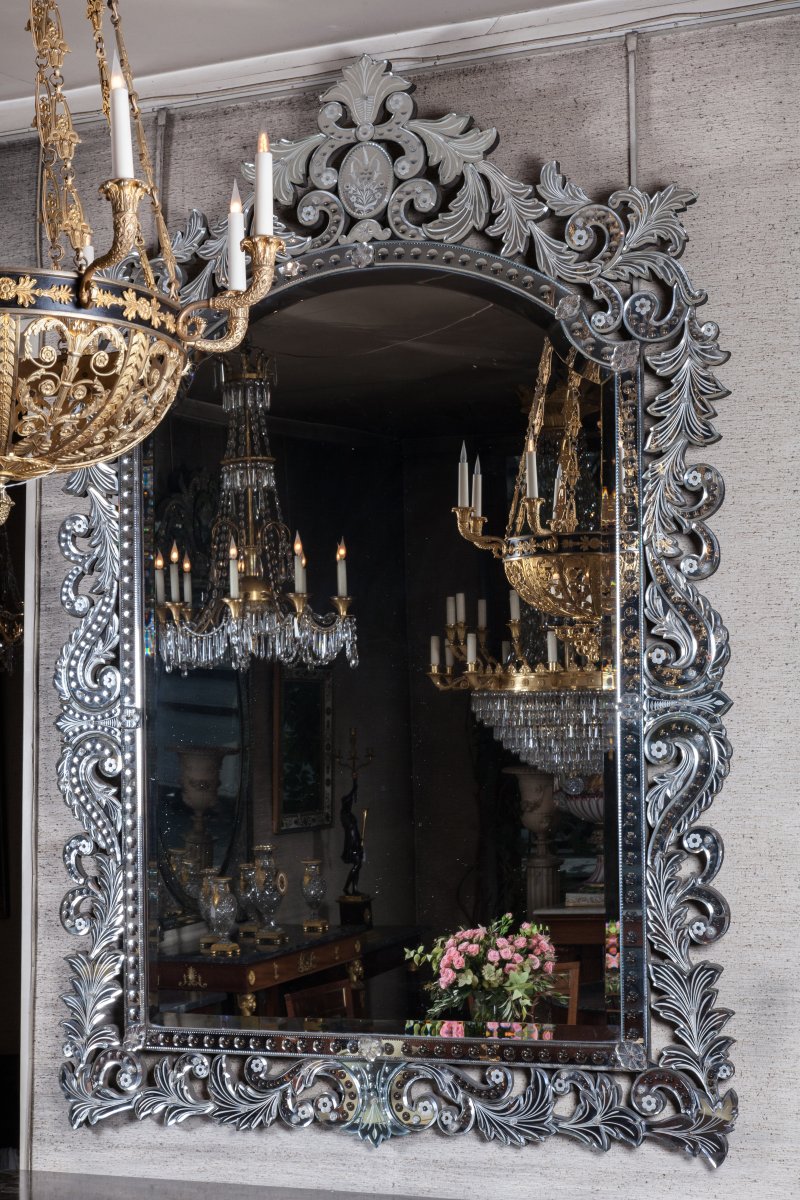 Grand MIROIR rectangulaire "de VENISE" à fronton et encadrement ajouré taillé à décor de volutes et feuillages.