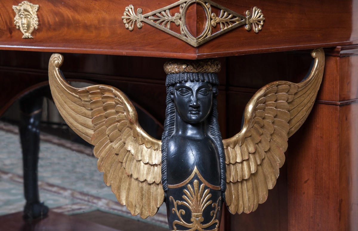Le modèle de ces cariatides en chimères, ailes déployées, s'inspire d'une esquisse de Percier et Fontaine, conservée au Musée des Arts Décoratifs de Budapest (n° 24-283).