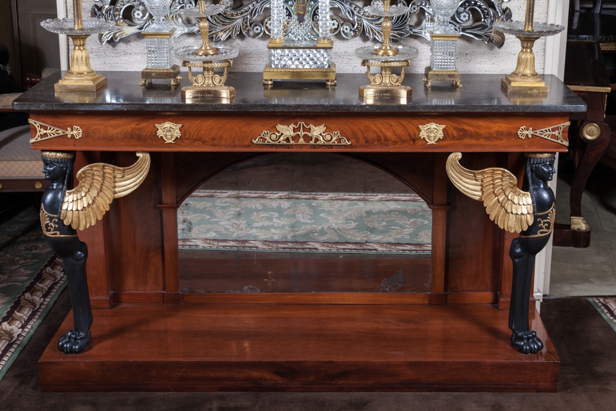 Large CONSOLE d'APPLIQUE rectangulaire en placage d'acajou. Montants antérieurs en chimères ailées et jarrets de lion en bois patiné et doré. Fond en placage d'acajou à pilastres encadrant un miroir cintré. Base socle. Dessus de marbre noir. Ornementation de bronzes dorés: griffons ailés, têtes de Mercure, palmettes et rinceaux ajourés.