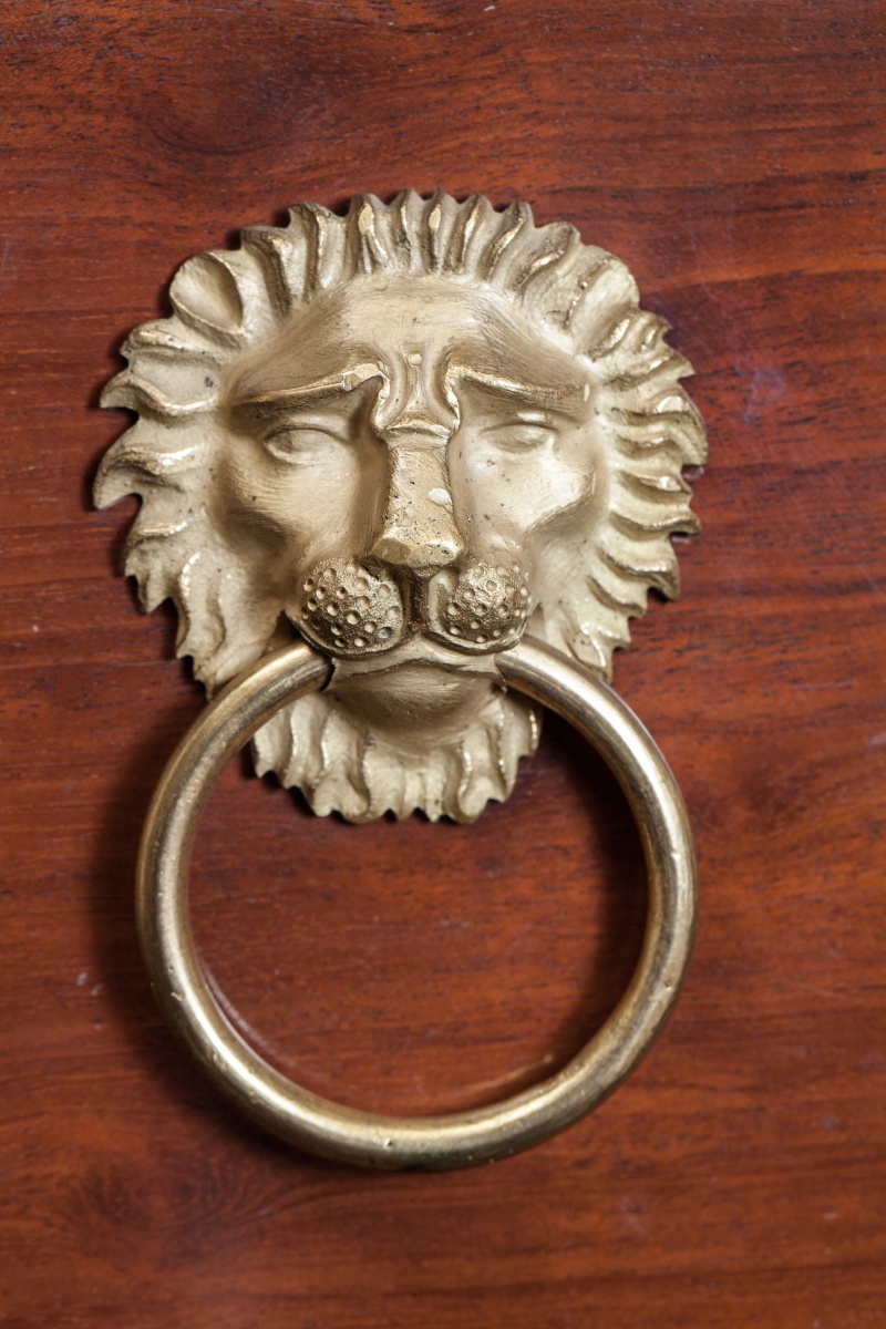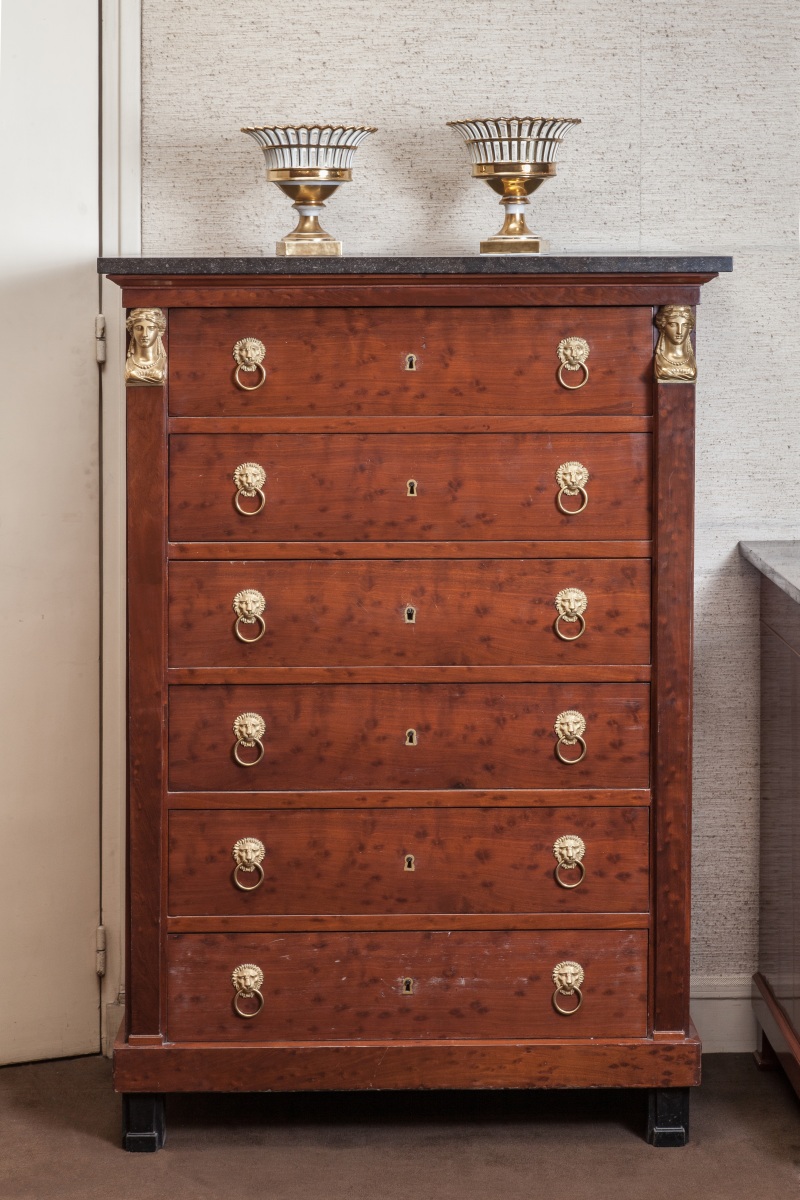 CHIFFONNIER en placage d'acajou moucheté ouvrant à six tiroirs. Montants en gaine à têtes de femme antique en bronze doré. Poignées de tirage à mufles de lion et anneau mobile en bronze doré. Serrures à double canon. Dessus de marbre noir de Belgique.