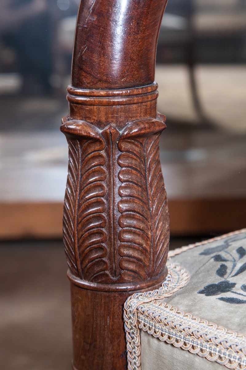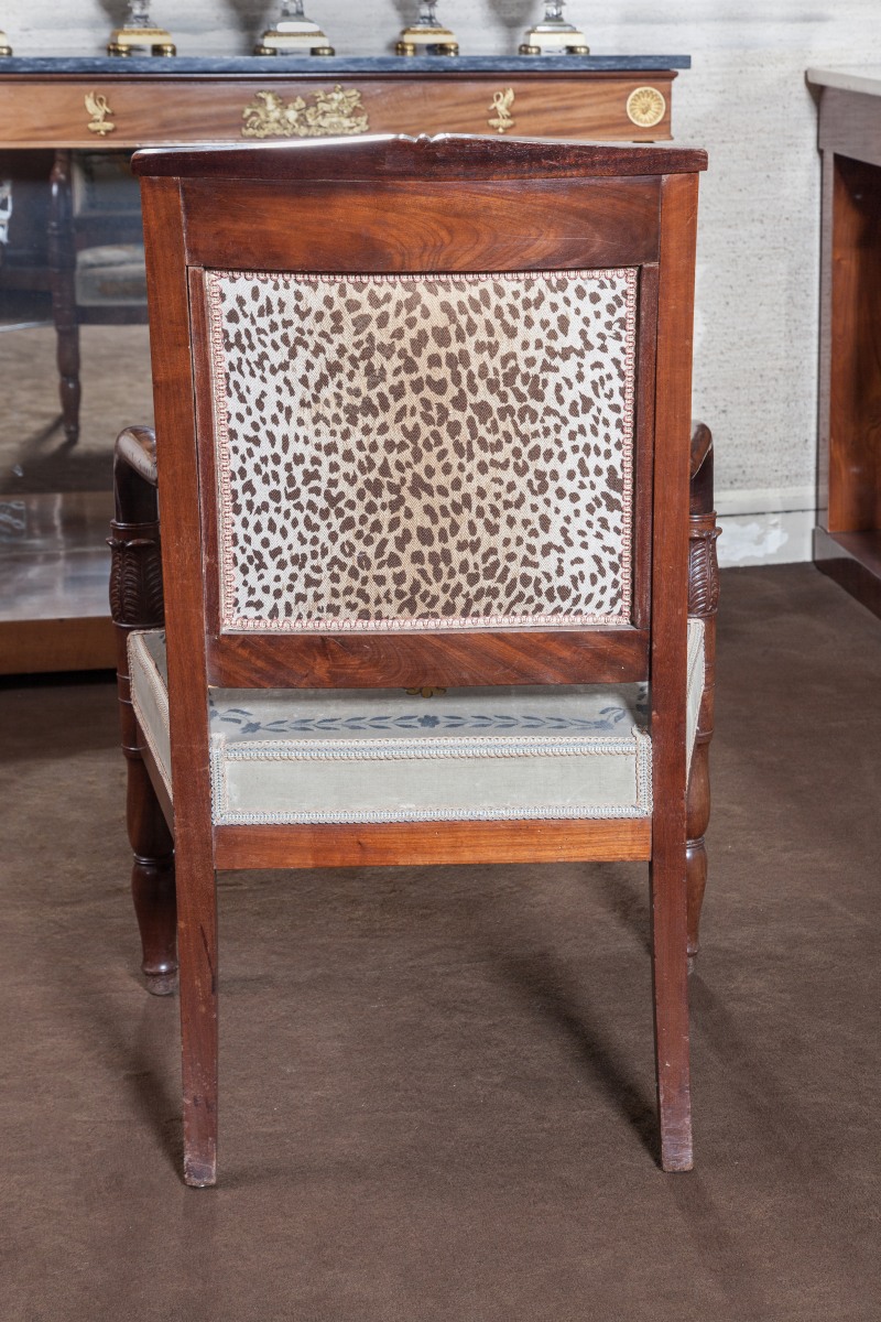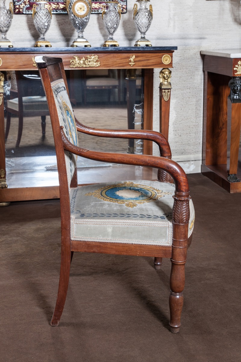 Suite de HUIT FAUTEUILS en acajou à dossier à fronton feuillagé. Supports d'accotoirs en fleurs de lotus. Pieds antérieurs réticulés, pieds arrière en sabre.