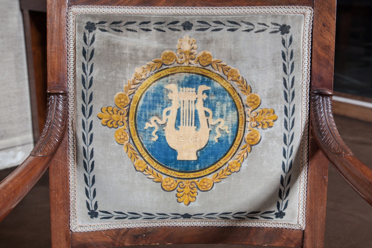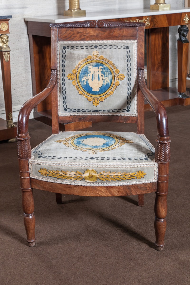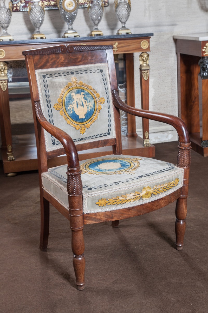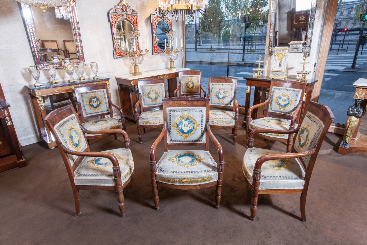 Suite de HUIT FAUTEUILS en acajou à dossier à fronton feuillagé. Supports d'accotoirs en fleurs de lotus. Pieds antérieurs réticulés, pieds arrière en sabre.
