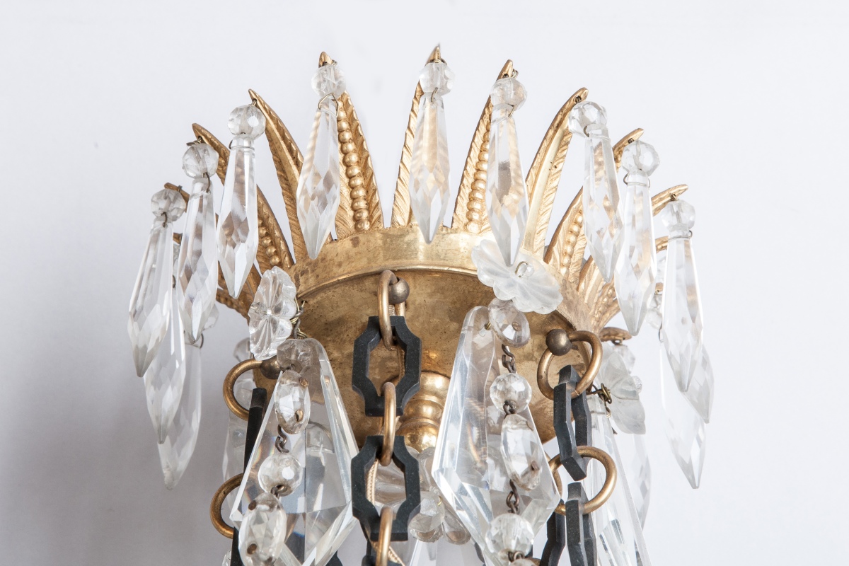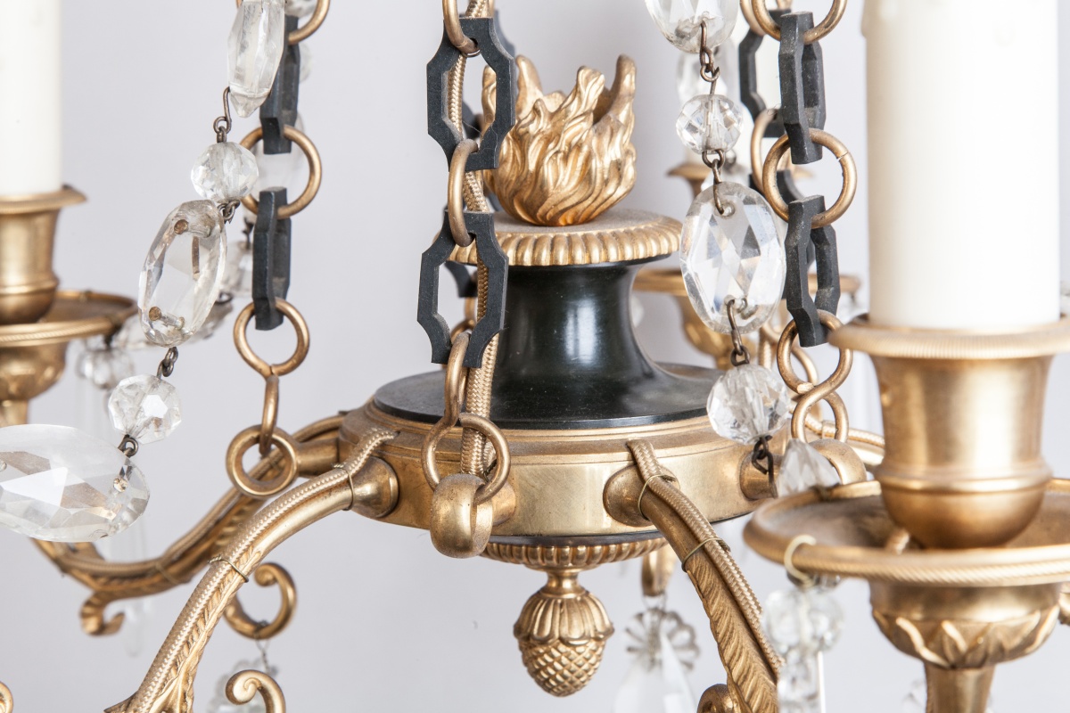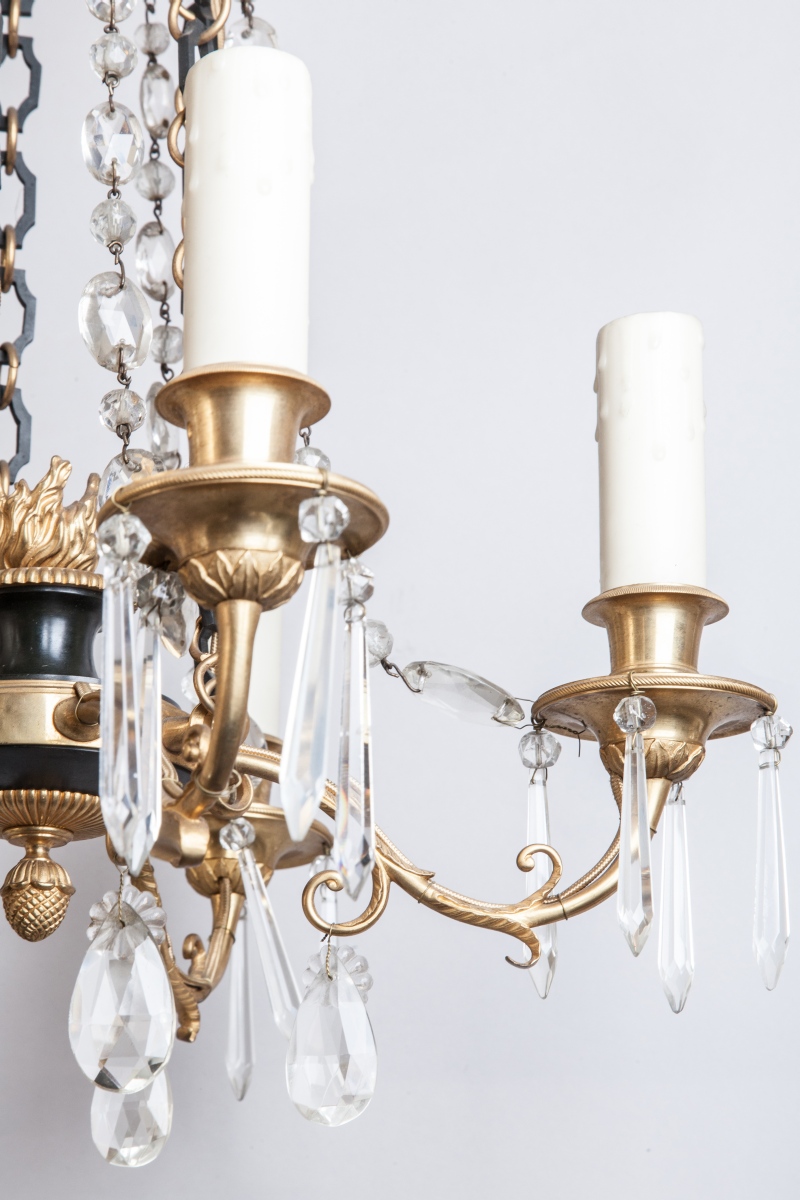 Petit LUSTRE à cinq lumières en bronze doré et bronze patiné orné de pendeloques et pampilles de verre et cristal, autour d'une lampe antique.