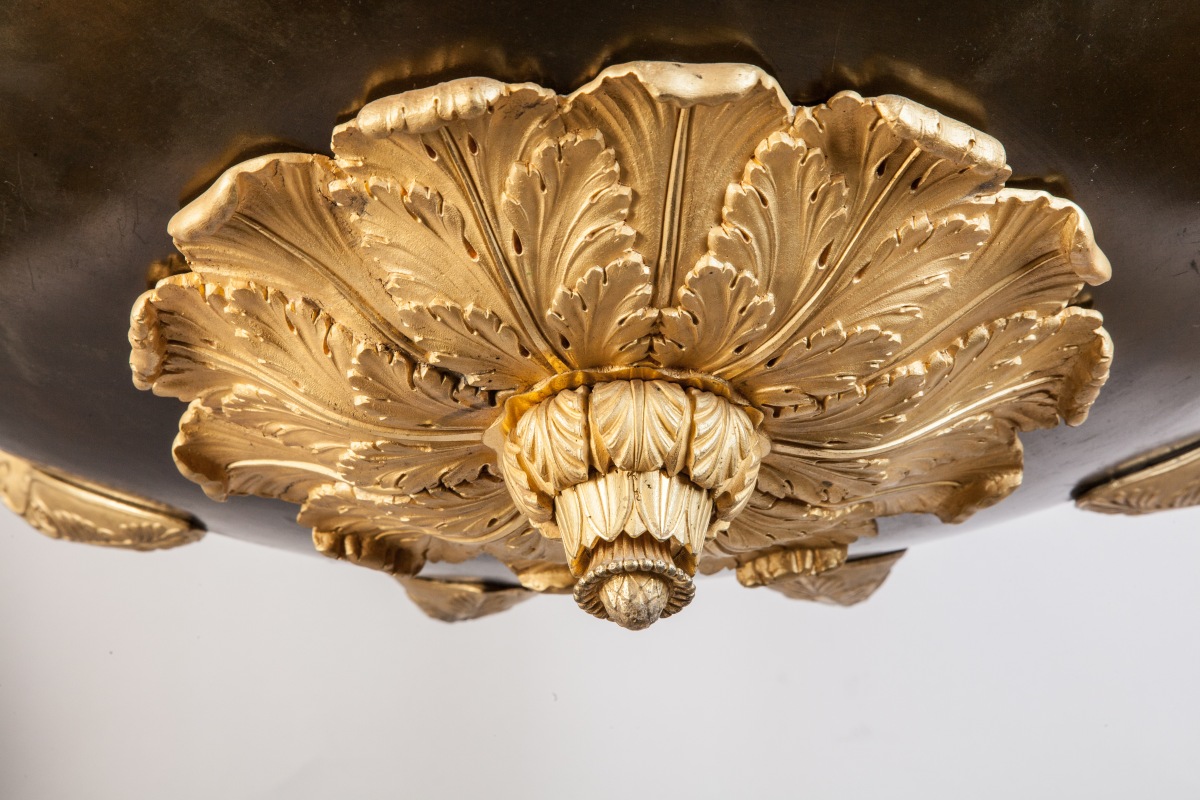 LUSTRE en forme de lampe antique flammée en bronze doré, bronze et tôle patiné à douze bras de lumière à mascarons de faunes, palmettes et feuillages.