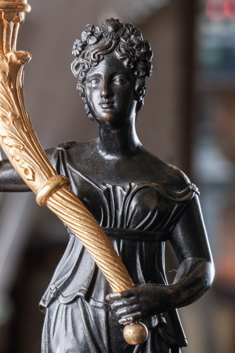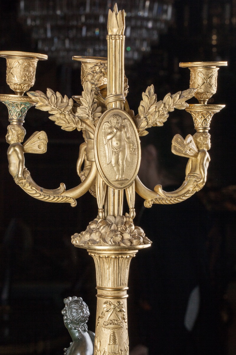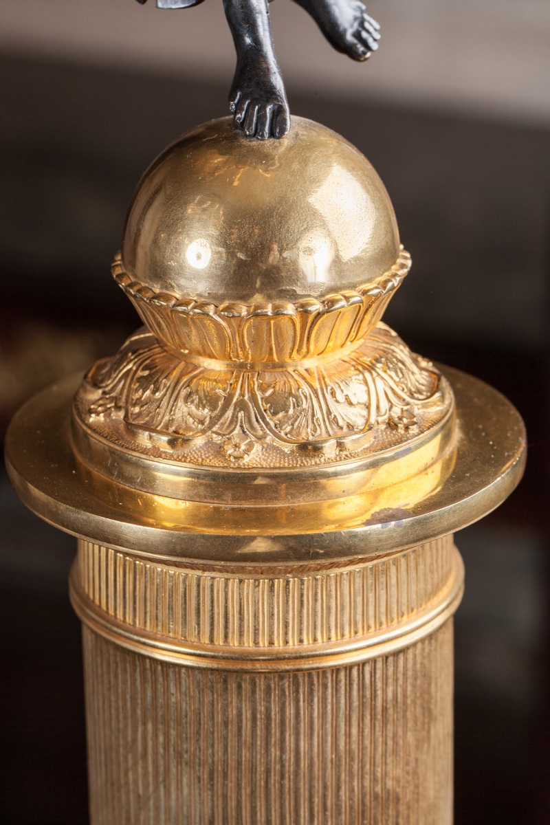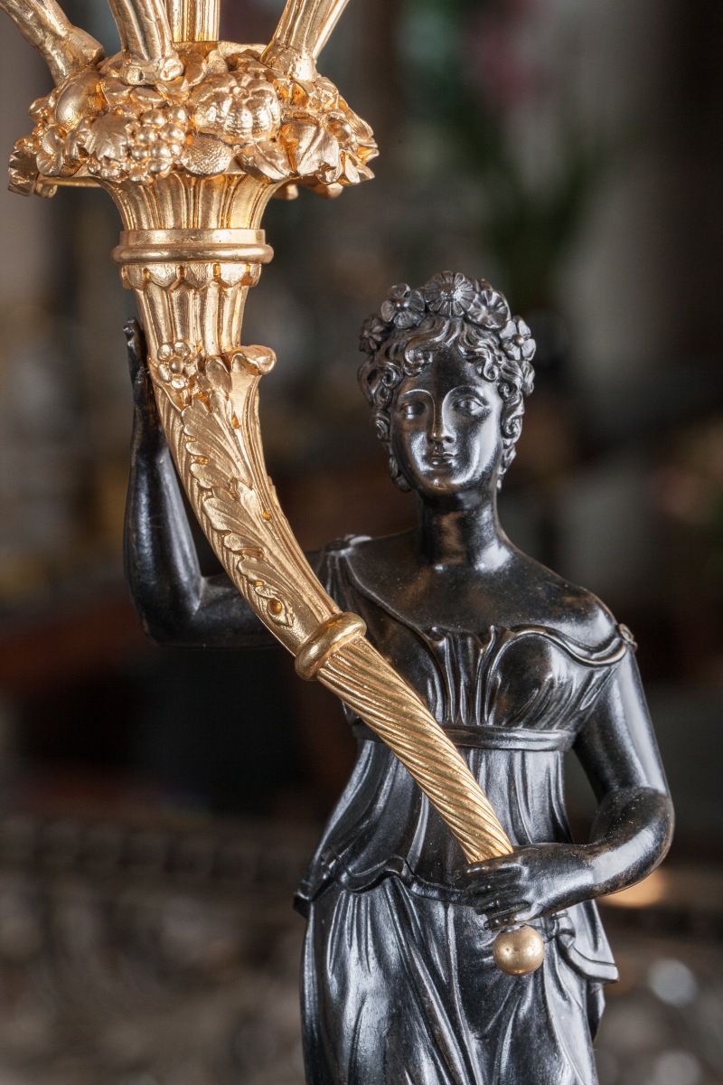 PAIRE de CANDÉLABRES en bronze patiné et bronze doré ornés d'une femme à l'antique sur un globe tenant une corne d'abondance à bouquet feuillagé de cinq lumières.