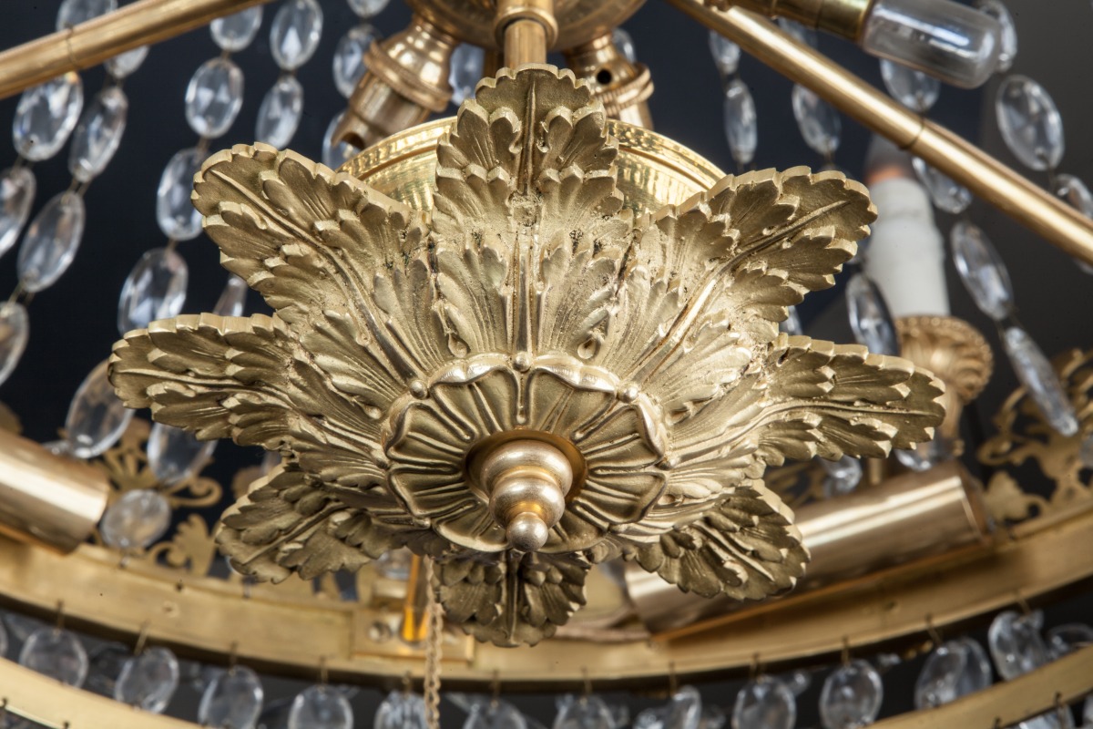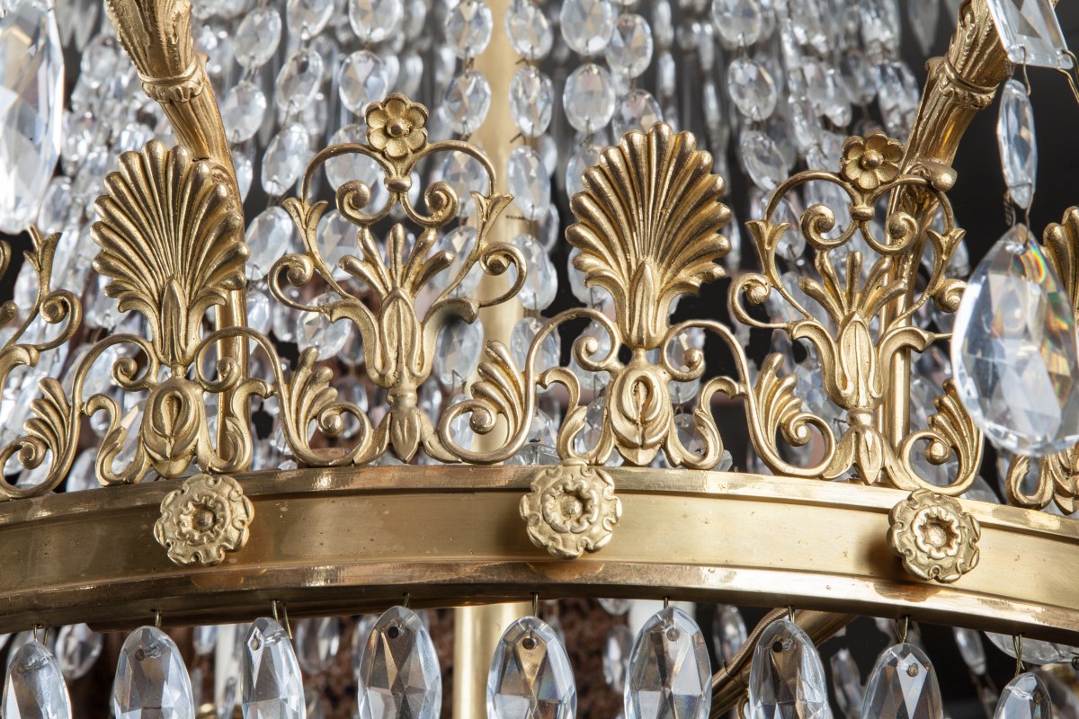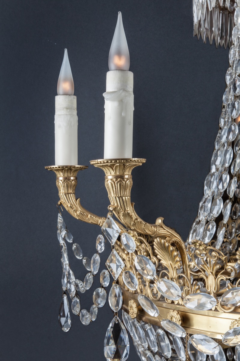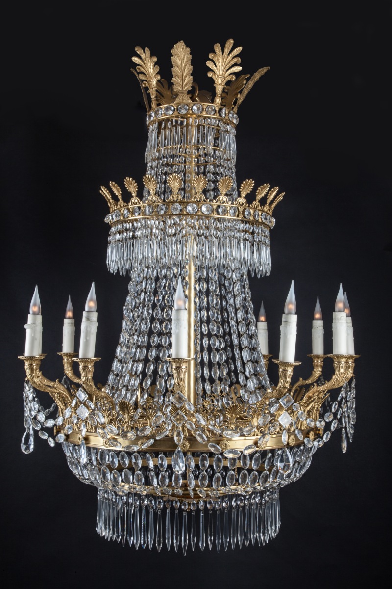 LUSTRE à trois couronnes en bronze doré à décor de palmettes, panaches, volutes feuillagées et fleurons, à douze lumières en corne d'abondance, orné de perles, olives et pampilles en cristal taillé.