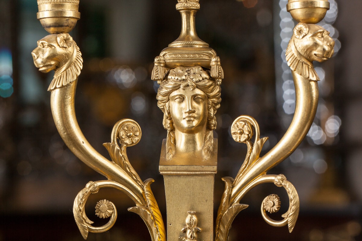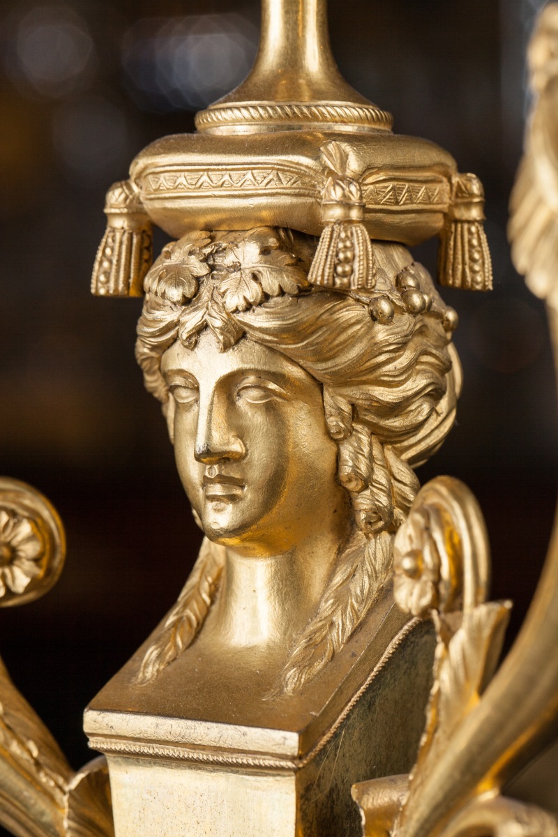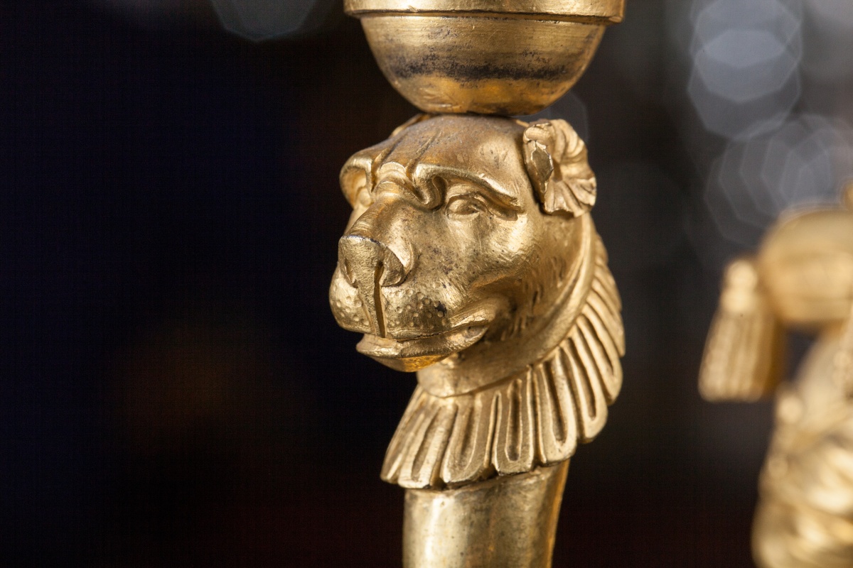PAIRE de CANDÉLABRES en bronze doré à trois lumières à décor d'une bacchante en gaine, d'un thyrse, de têtes de félins et volutes feuillagées.