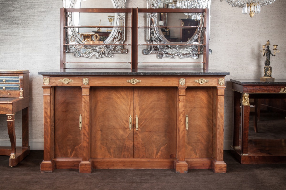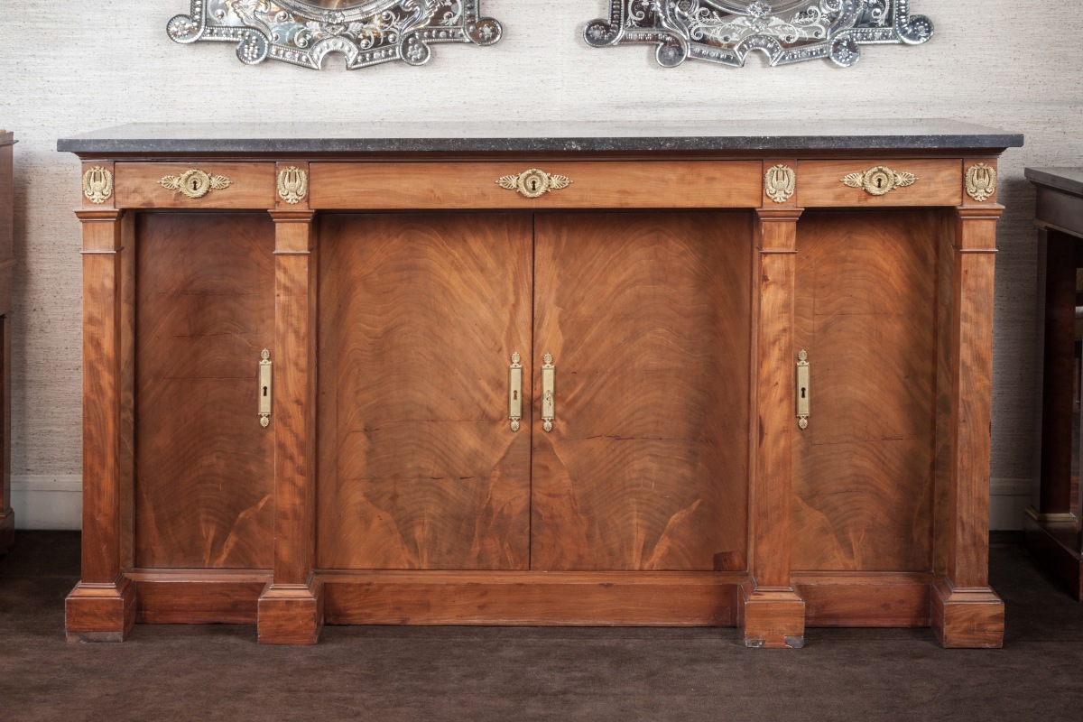 Important BUFFET À TRANSFORMATION en placage d'acajou flammé ouvrant à trois tiroirs en surplomb soutenus par quatre colonnes à section carrée et à quatre vantaux. Ornementation de bronzes dorés. Dessus de marbre noir de Belgique coulissant et découvrant un dressoir escamotable se développant en deux niveaux d'étagères.