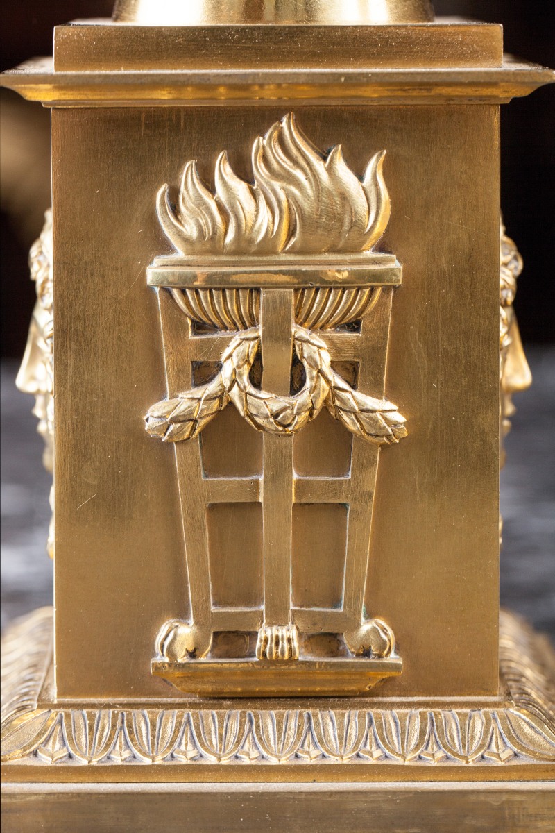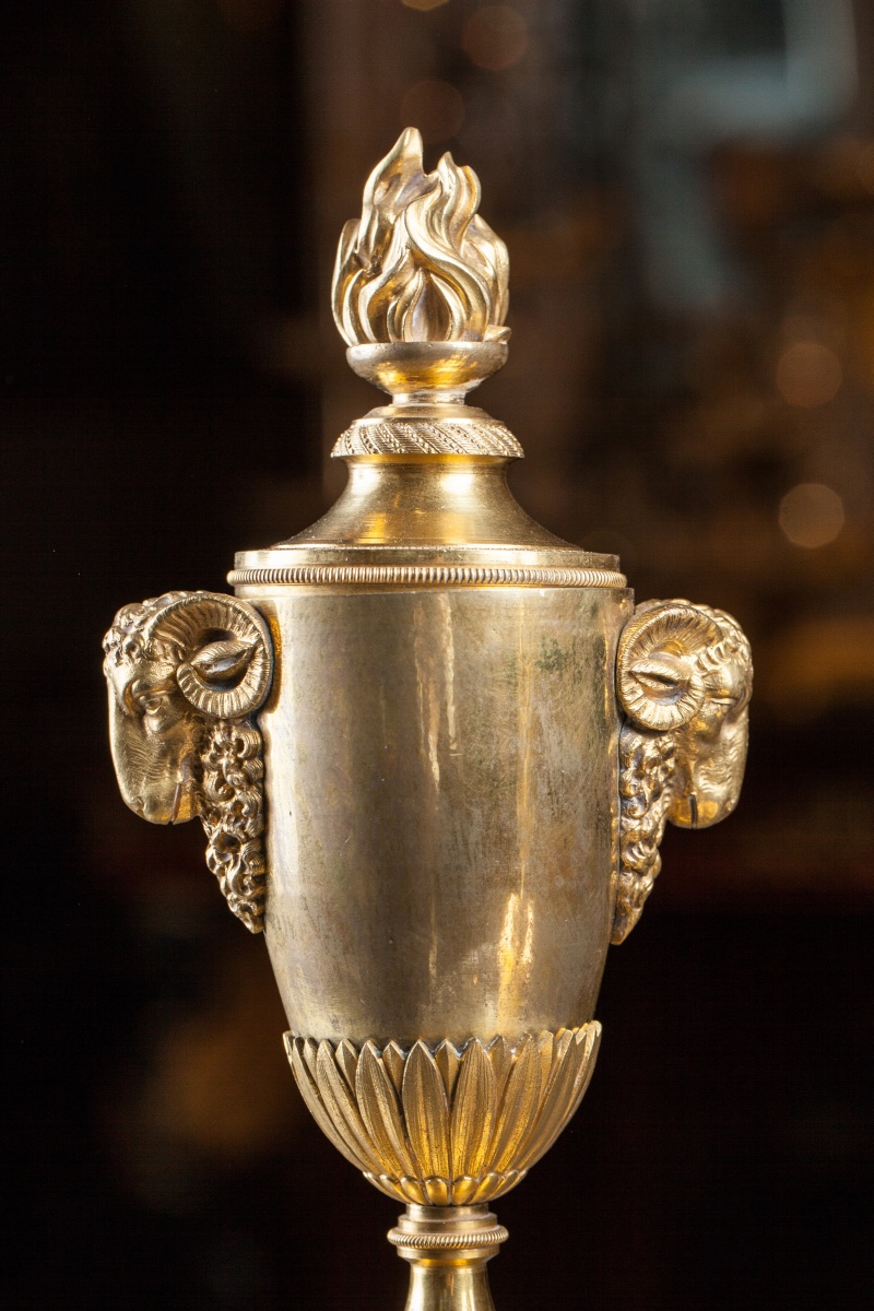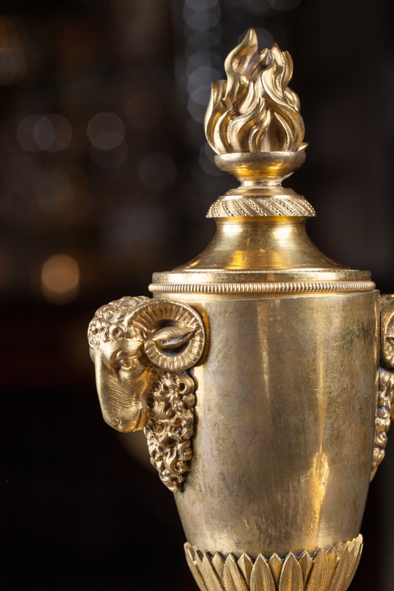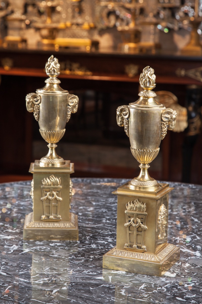 PAIRE de CASSOLETTES ovoïdes en bronze ciselé et doré en forme de pots à feu. Prises en têtes de bouquetins. Socles à décor d'autel embrasé et mascarons féminins.