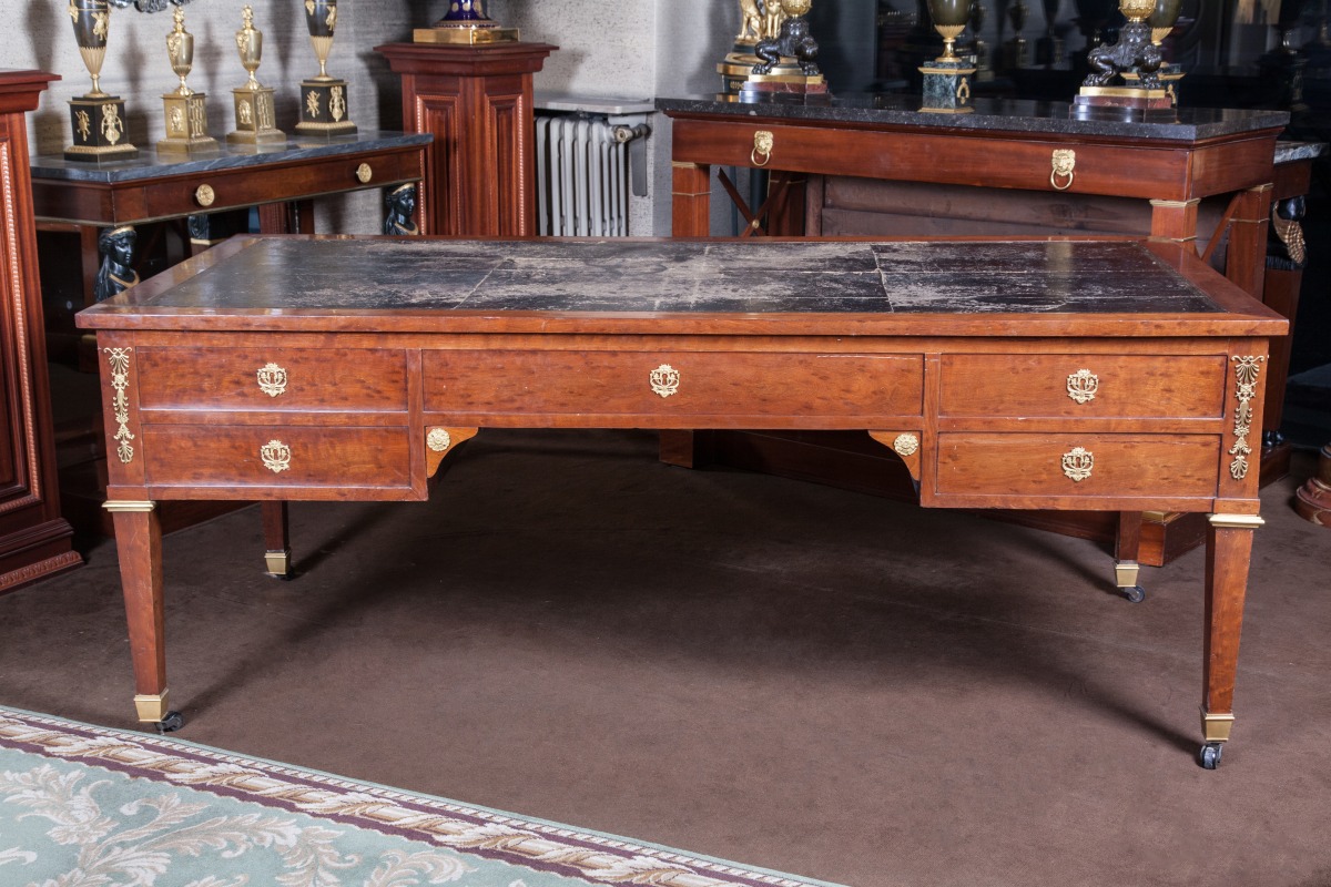 Important BUREAU PLAT en placage d'acajou moucheté ouvrant à cinq tiroirs dont quatre en caissons et deux tirettes latérales. Pieds en gaine. Ornementation de bronzes dorés: fleurons, feuillages et palmettes. Plateau gainé de maroquin doré aux petits fers.