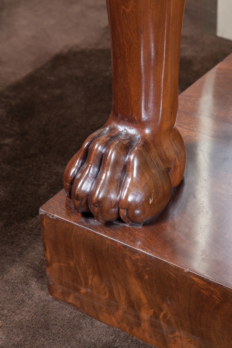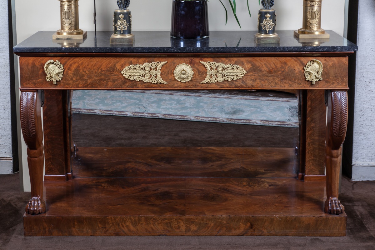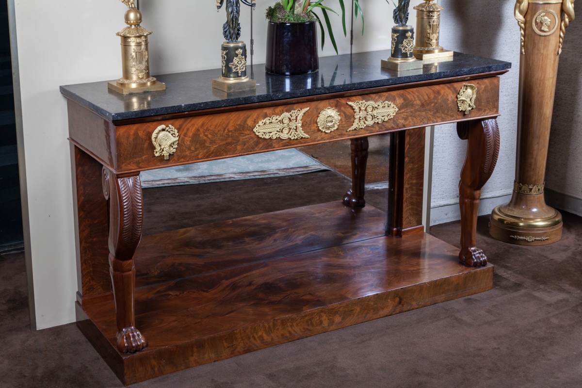 Large CONSOLE DESSERTE rectangulaire en acajou et placage d'acajou flammé ouvrant à un tiroir. Montants antérieurs en jarrets de lion sculptés d'une palmette. Fond de glace entre deux pilastres sur une base socle. Ornementation de bronzes ciselés et dorés: casques romains, feuilles de chêne et de laurier, fleurons, palmettes et rinceaux feuillagés. Dessus de granit noir de Belgique.
