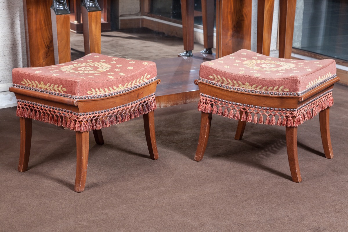 PAIRE de TABOURETS rectangulaires de forme curule en acajou et placage d'acajou. Pieds en sabre.