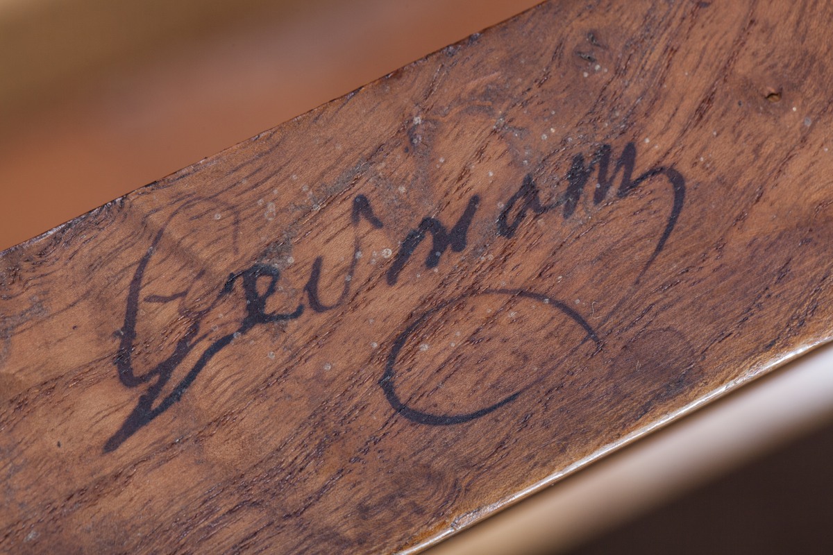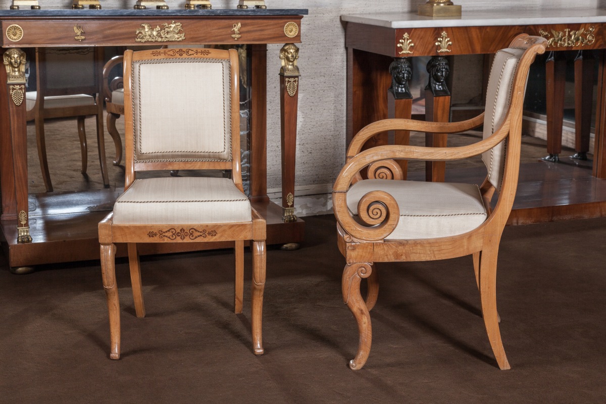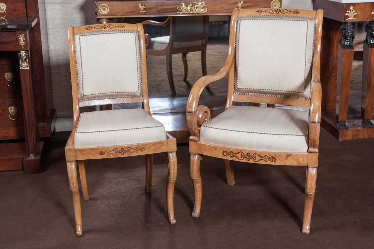 PAIRE DE FAUTEUILS et PAIRE de CHAISES À CHÂSSIS à dossier plat légèrement renversé en frêne à décor marqueté en amarante de fleurons, palmettes et volutes. Pieds avants en console, pieds arrières en sabre. Accotoirs à enroulements.