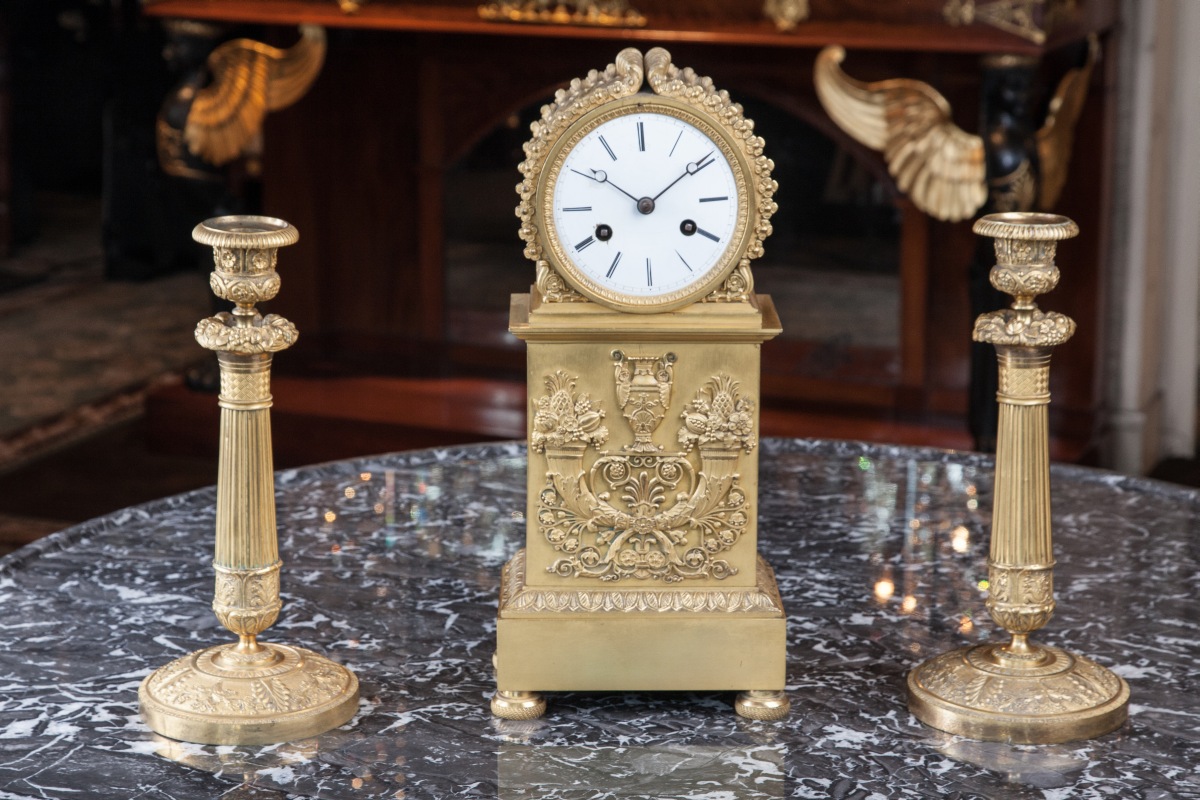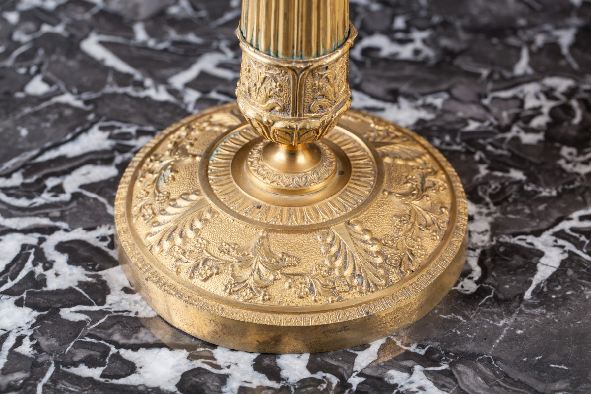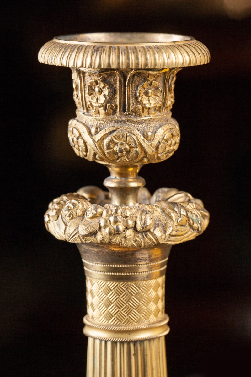 PAIRE de BOUGEOIRS en bronze doré à fût en colonne à base étranglée à cannelures et godrons. Chapiteaux en corbeille de fleurs et de fruits. Base à palmettes, branches fleuries et feuilles d'eau.