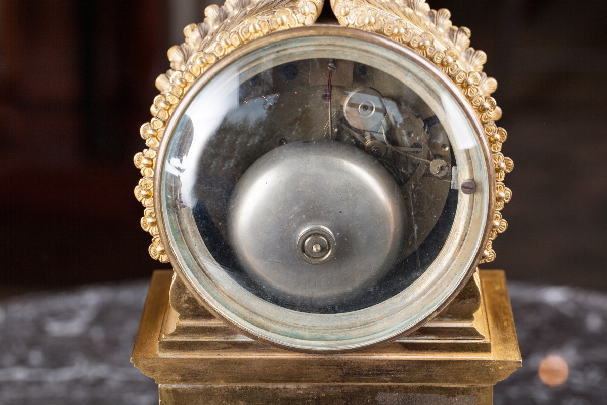 PENDULE BORNE en bronze doré mat et brillant, le mouvement entouré de palmettes et feuilles de lotus. Façade ornée de corne d'abondance, vase et volutes fleuries. Quatre pieds patins. Cadran d'émail. Suspension à fil.