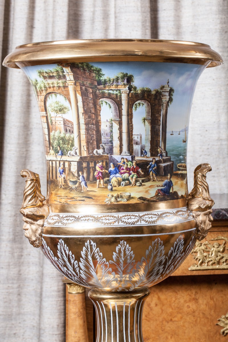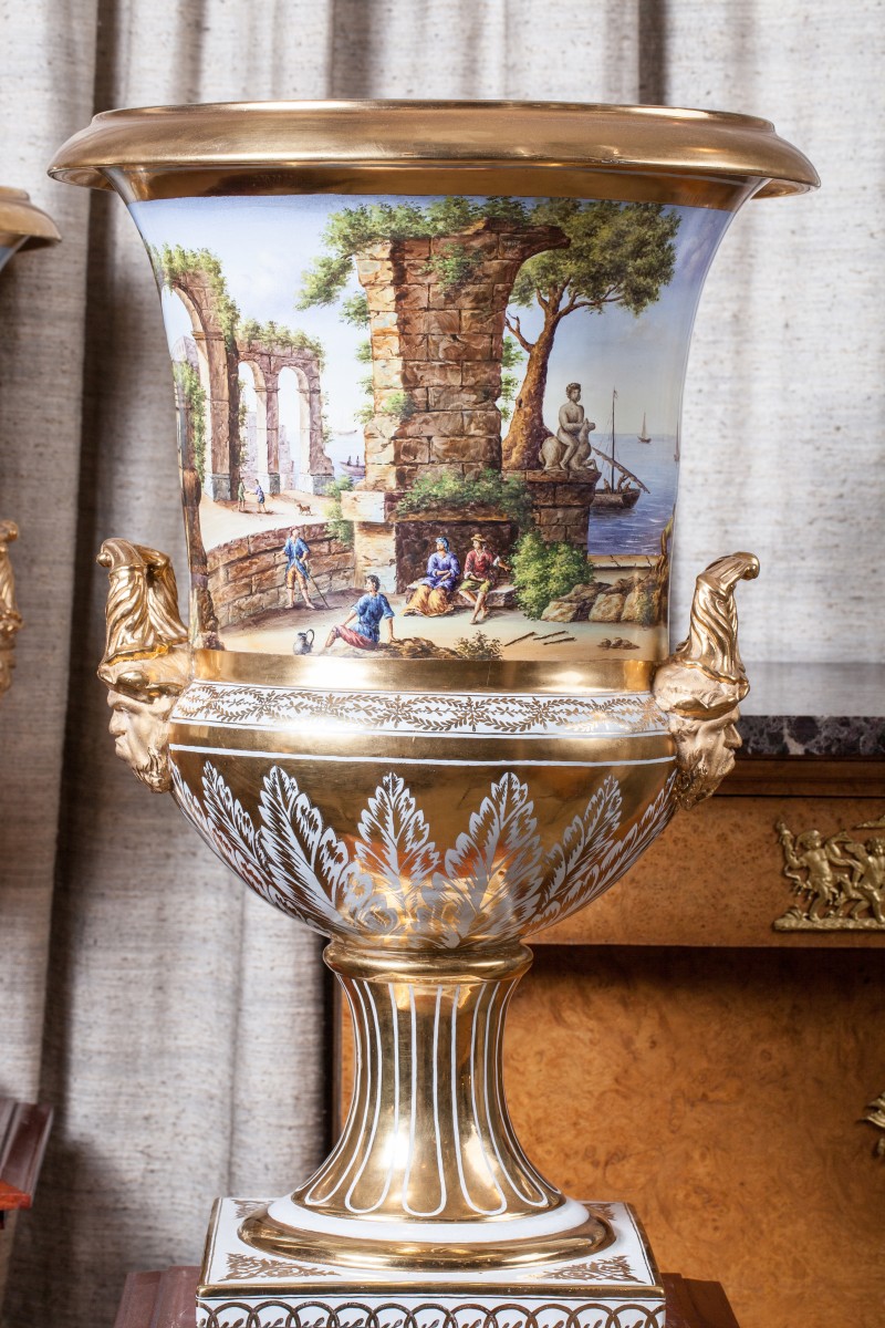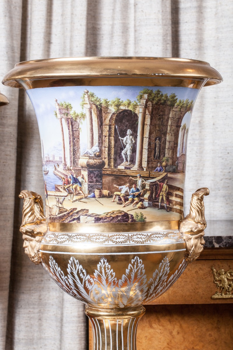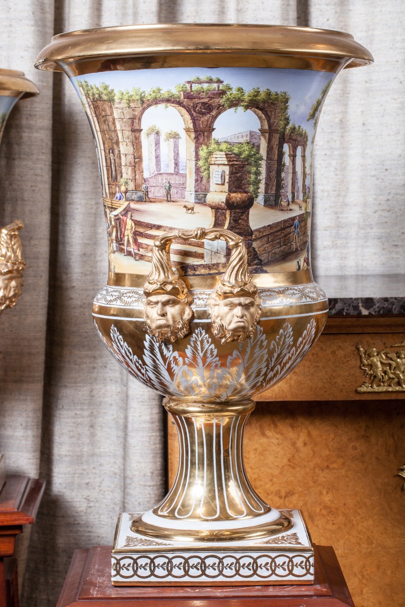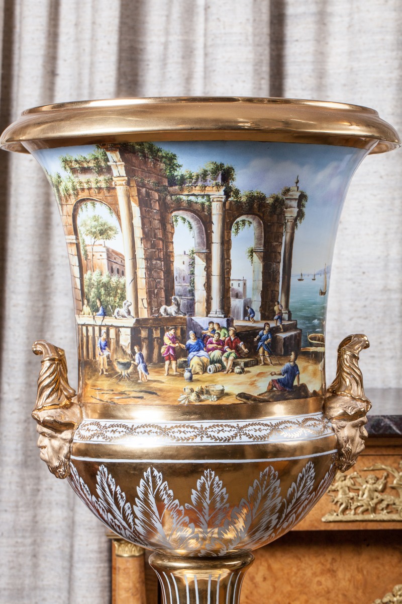 PAIRE de grands VASES MÉDICIS en porcelaine polychrome et doré à décor de personnages dans des ruines antiques au bord de la mer. Anses à mascarons de faunes.