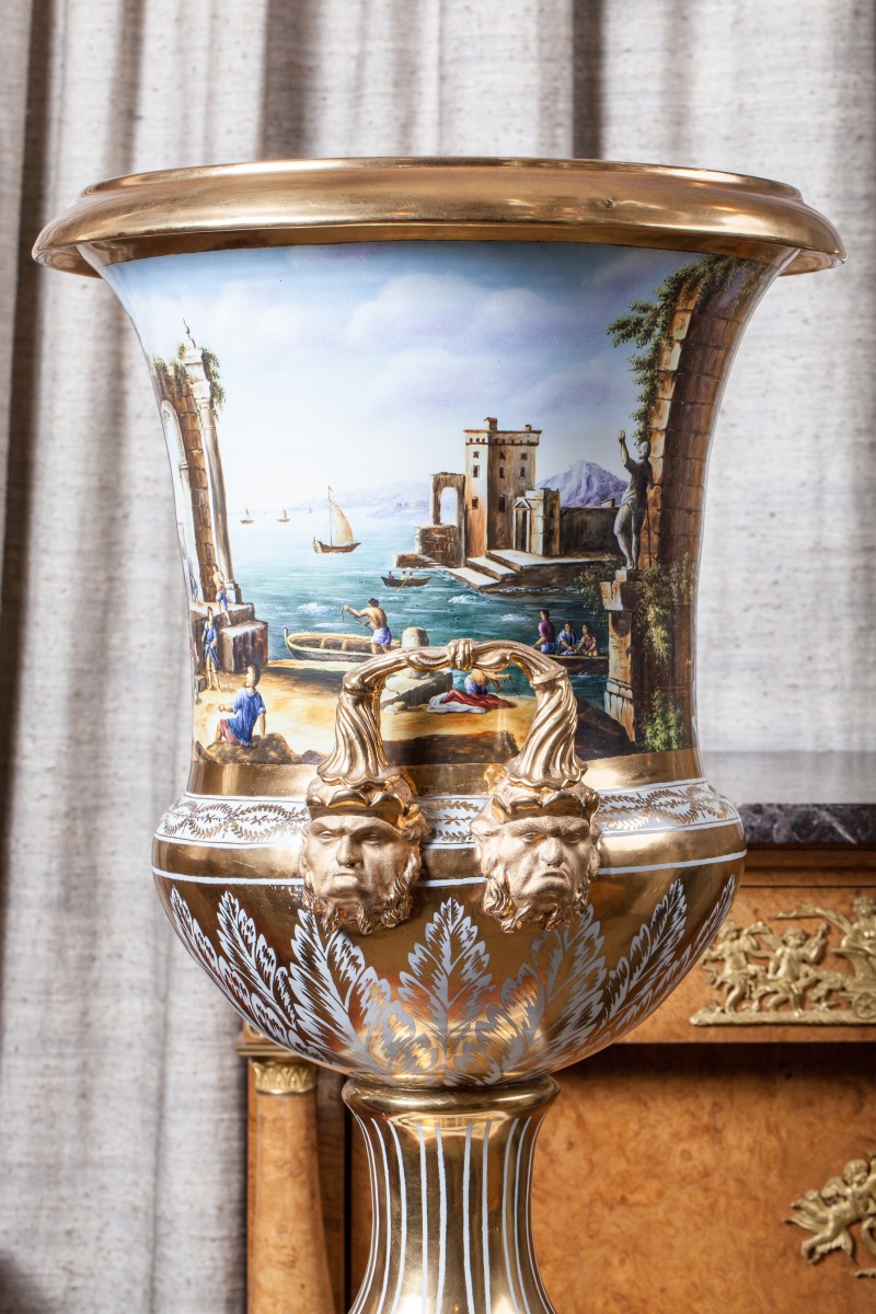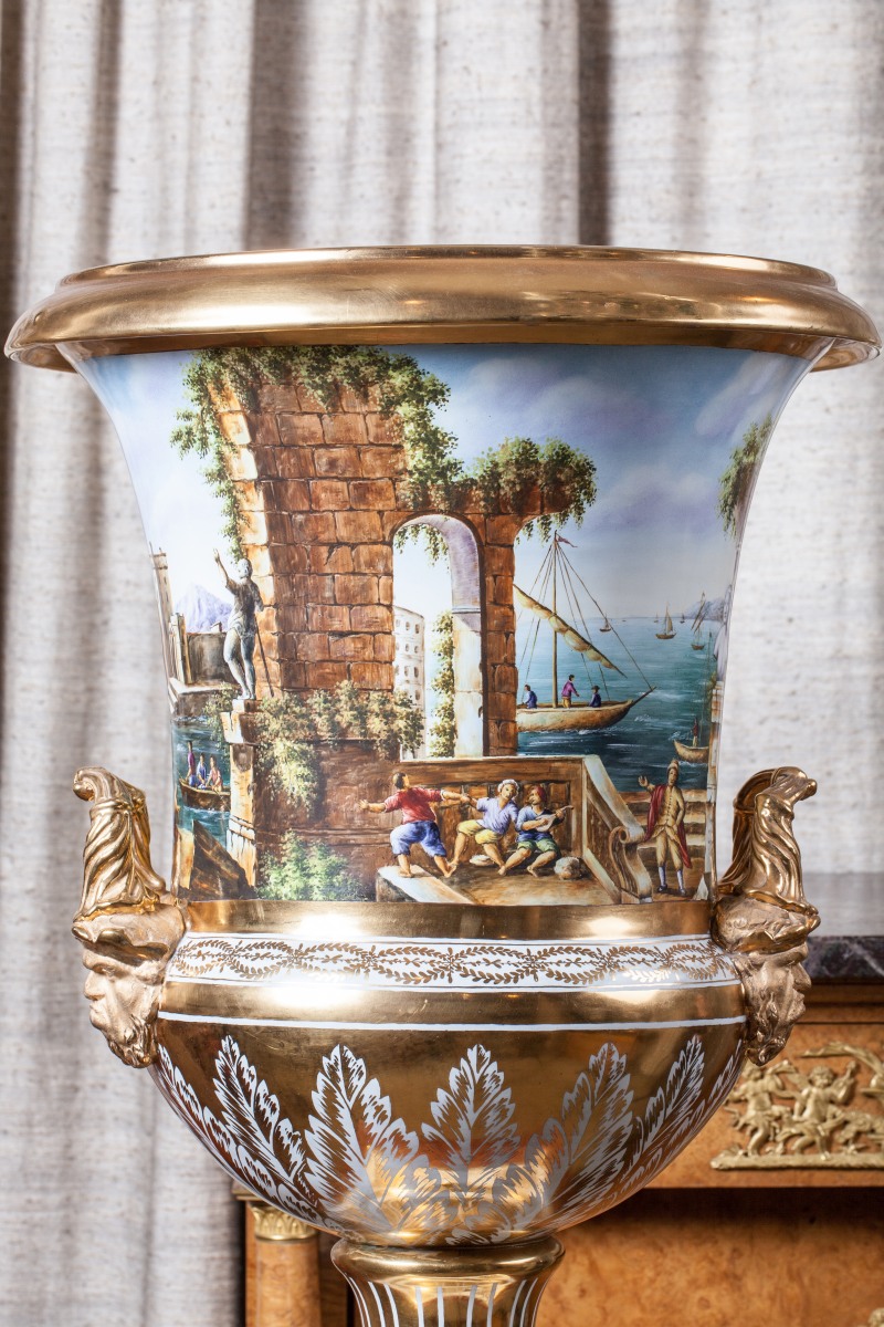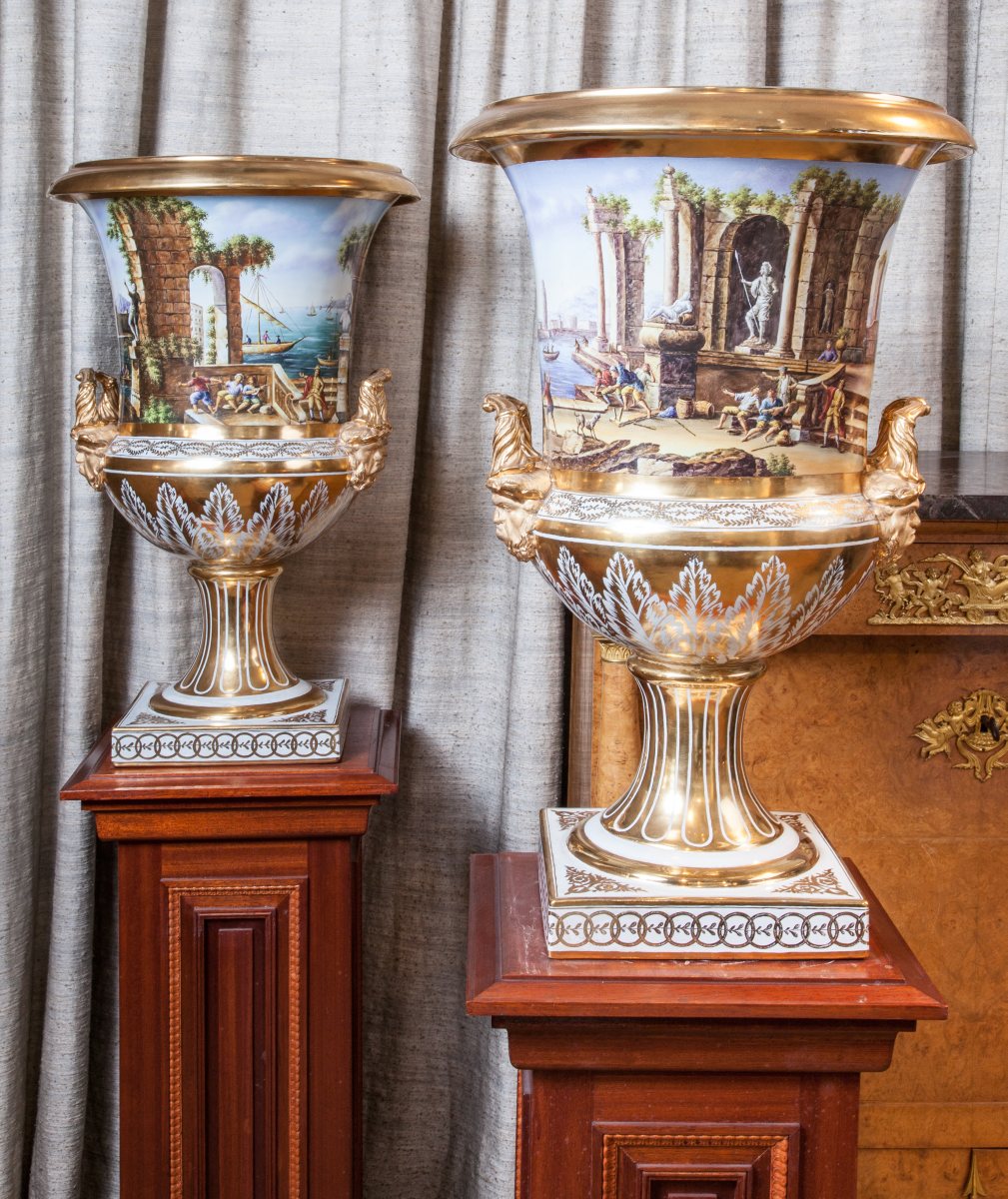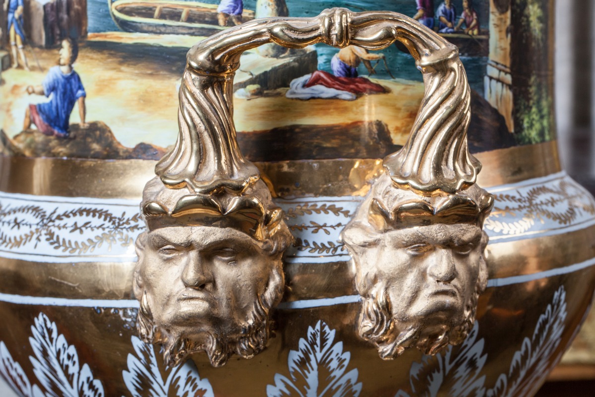 PAIRE de grands VASES MÉDICIS en porcelaine polychrome et doré à décor de personnages dans des ruines antiques au bord de la mer. Anses à mascarons de faunes.