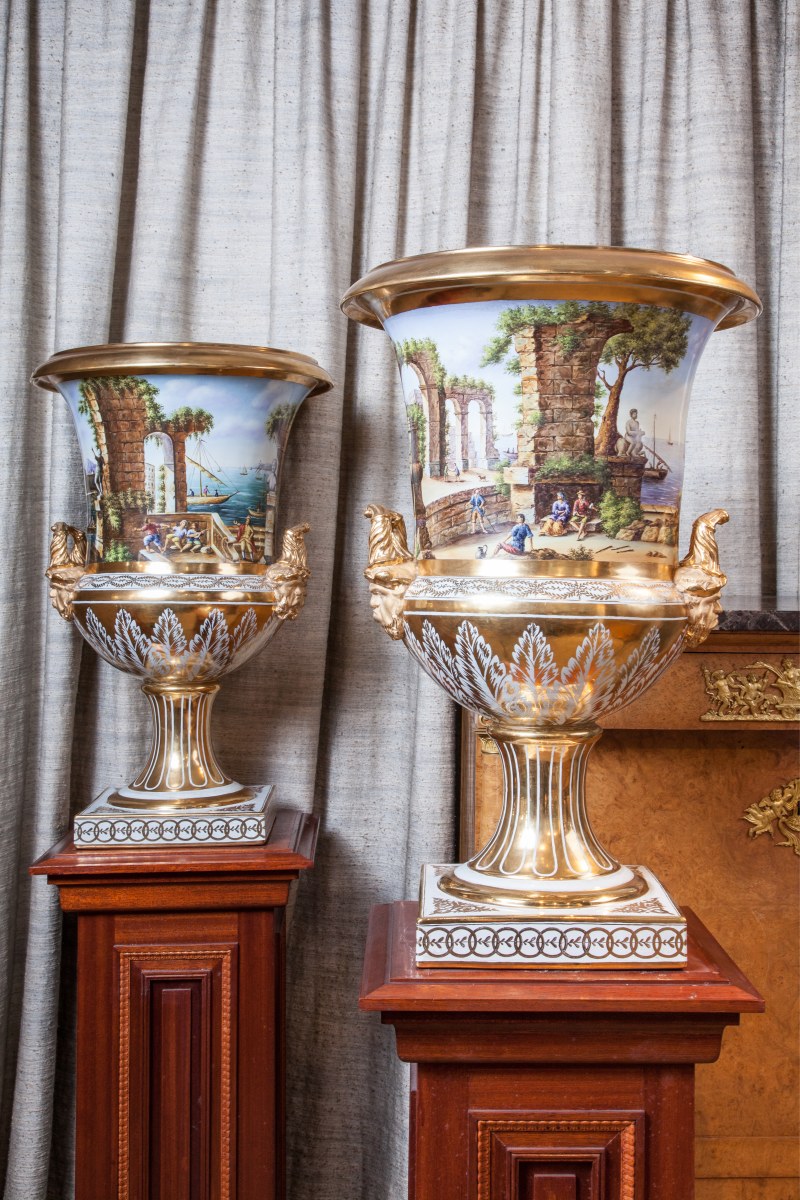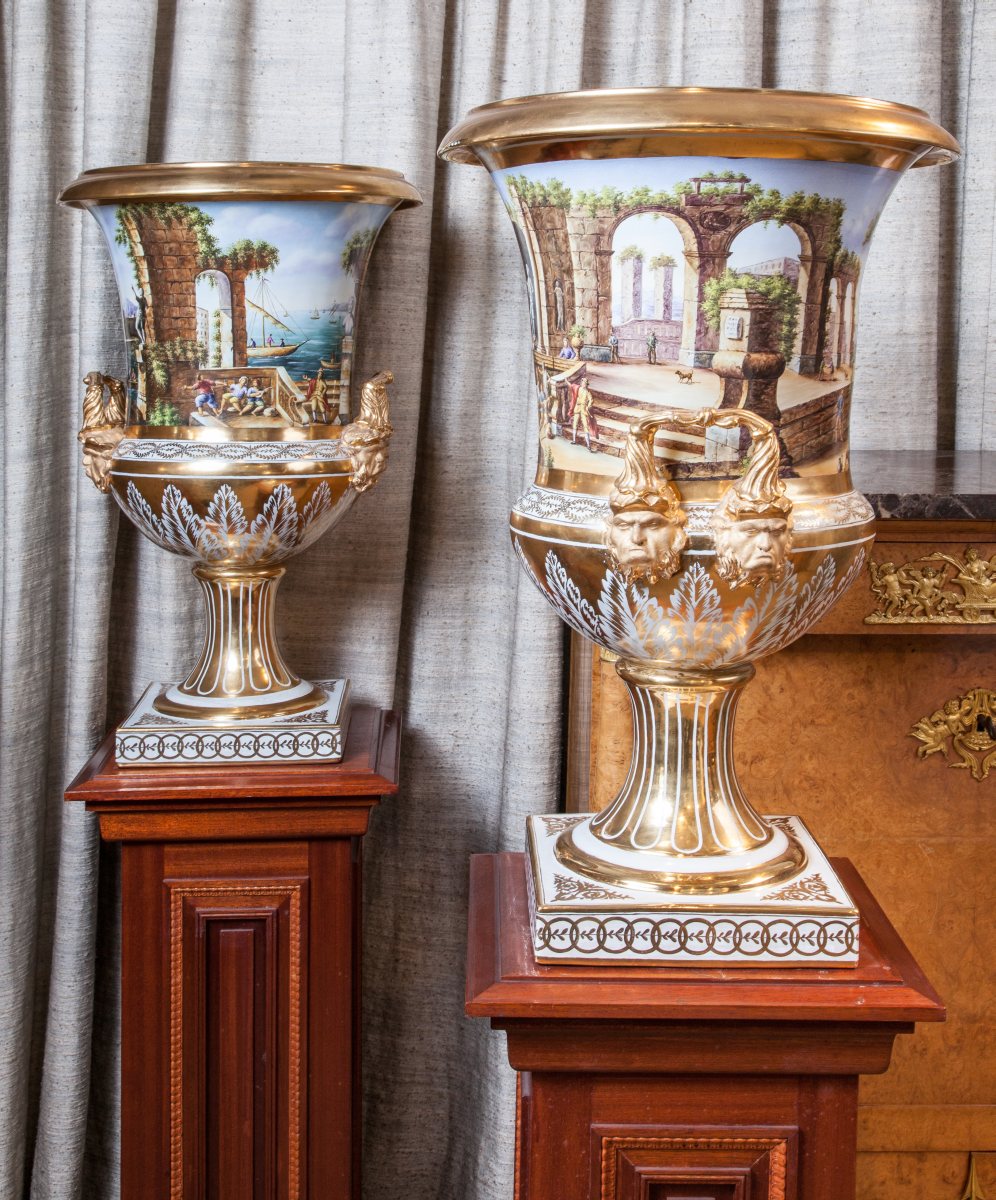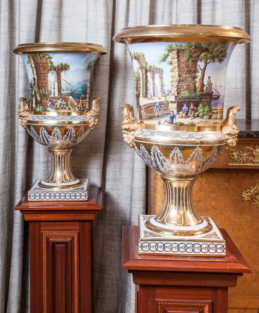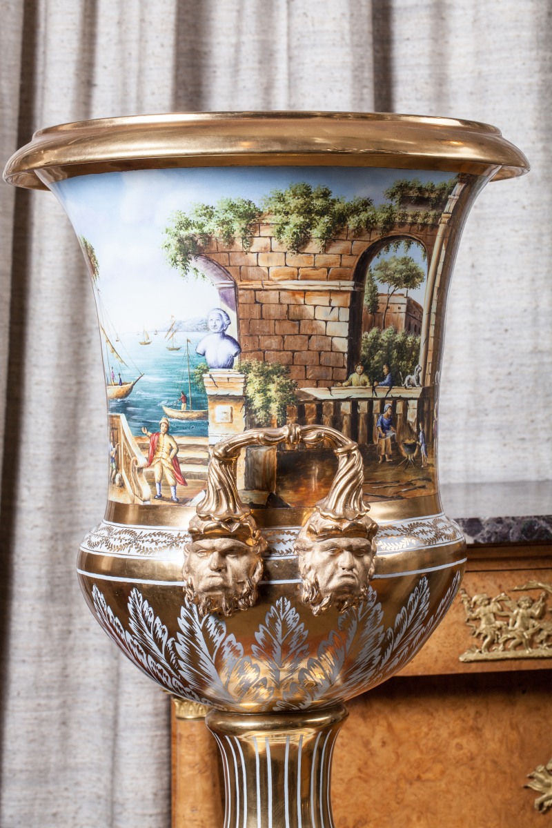PAIRE de grands VASES MÉDICIS en porcelaine polychrome et doré à décor de personnages dans des ruines antiques au bord de la mer. Anses à mascarons de faunes.