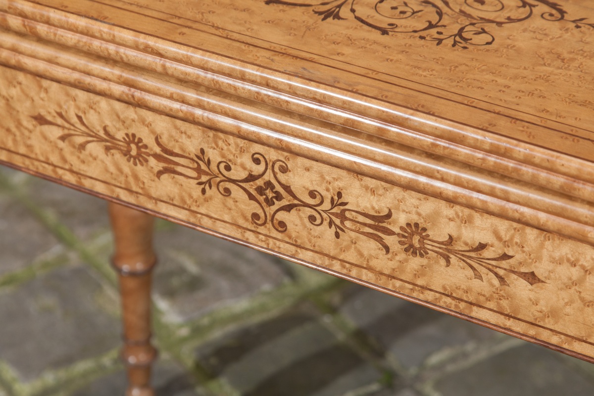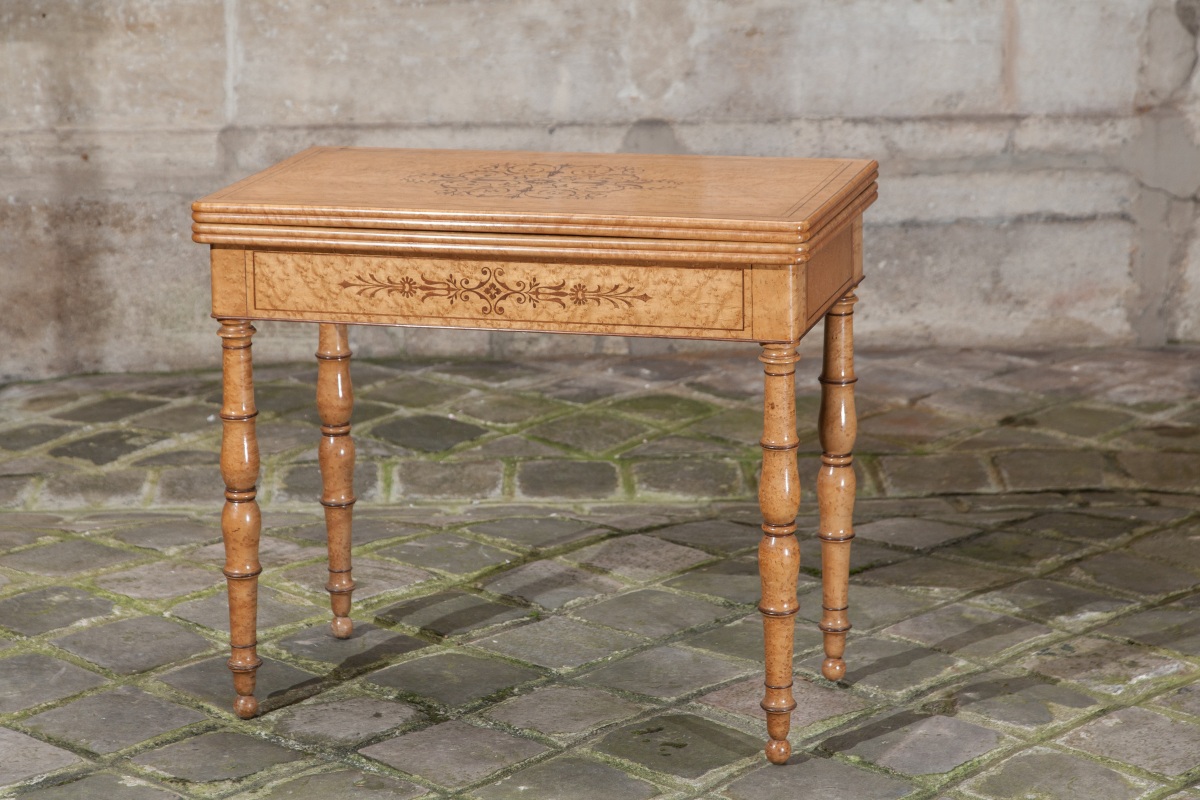 TABLE À JEUX à plateau serviette en placage d'érable moucheté à décor marqueté de filets, palmettes et volutes feuillagées en amarante. Pieds tournés à bagues d'amarante.