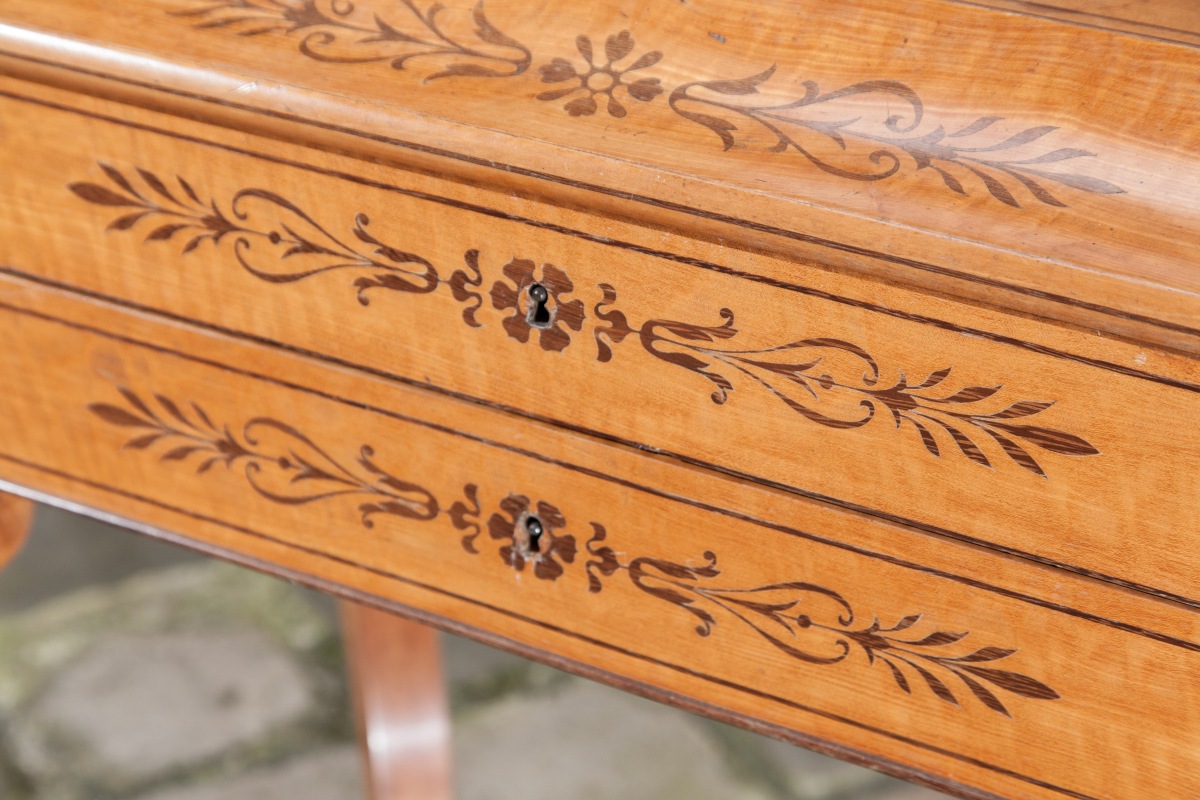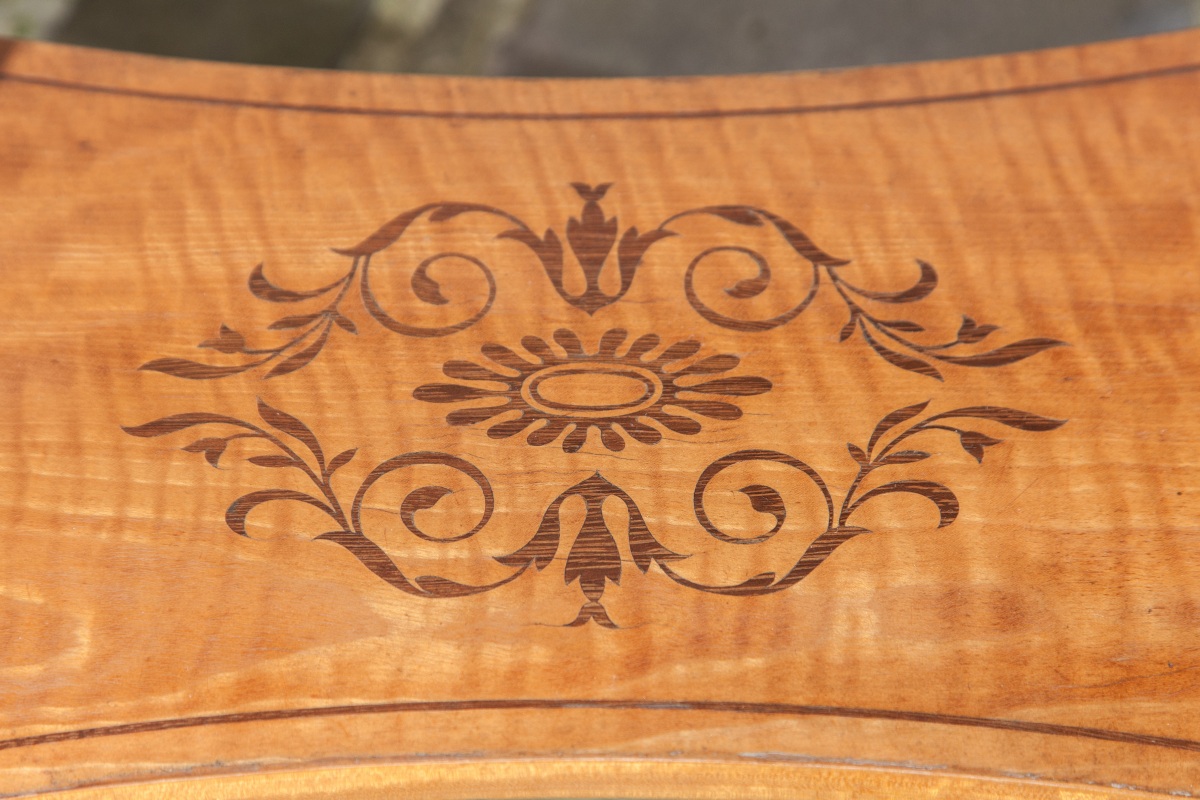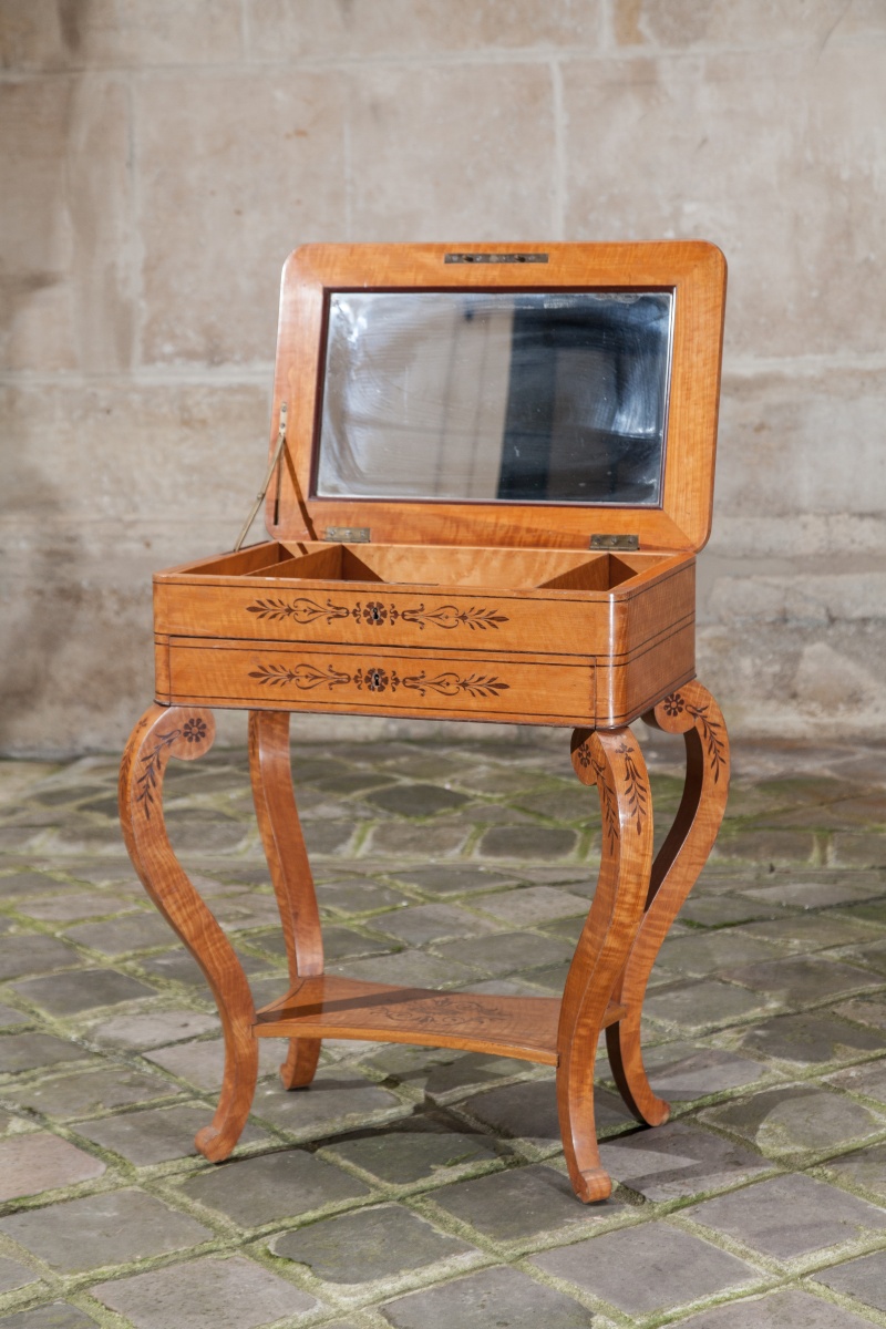 TABLE TRAVAILLEUSE à doucine renversée en placage de citronnier et érable moucheté à décor marqueté en amarante de filets, palmettes et fleurons. Plateau ouvrant garni d'un miroir découvrant des casiers. Un tiroir à façade. Montants sinueux à tablette d'entretoise.