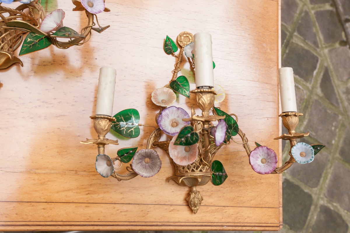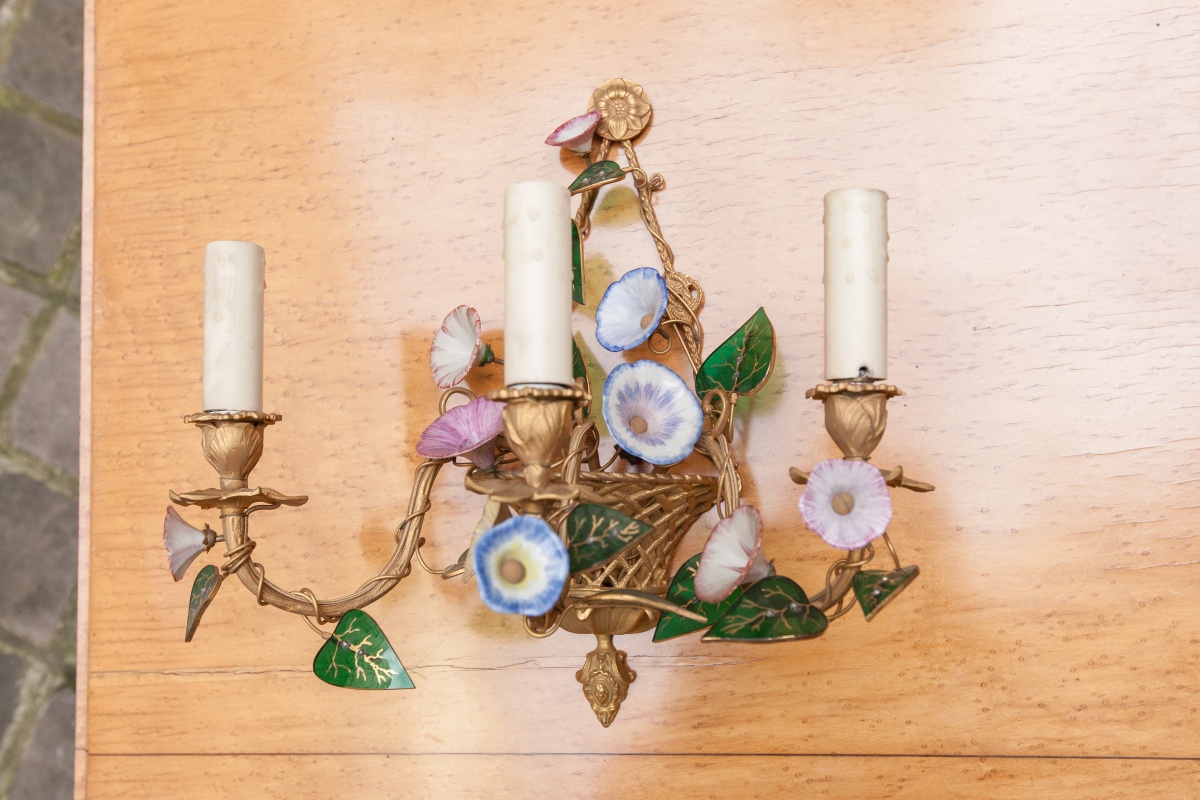 PAIRE d'APPLIQUES à trois lumières en bronze doré à décor de panier de vannerie et branches de liseron à fleurs de porcelaine et feuilles d'opaline verte.