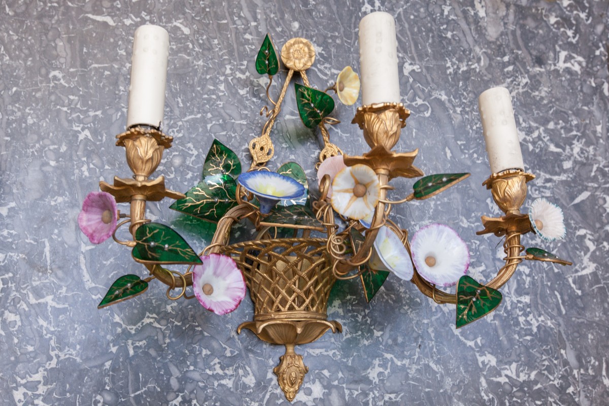 PAIRE d'APPLIQUES à trois lumières en bronze doré à décor de panier de vannerie et branches de liseron à fleurs de porcelaine et feuilles d'opaline verte.