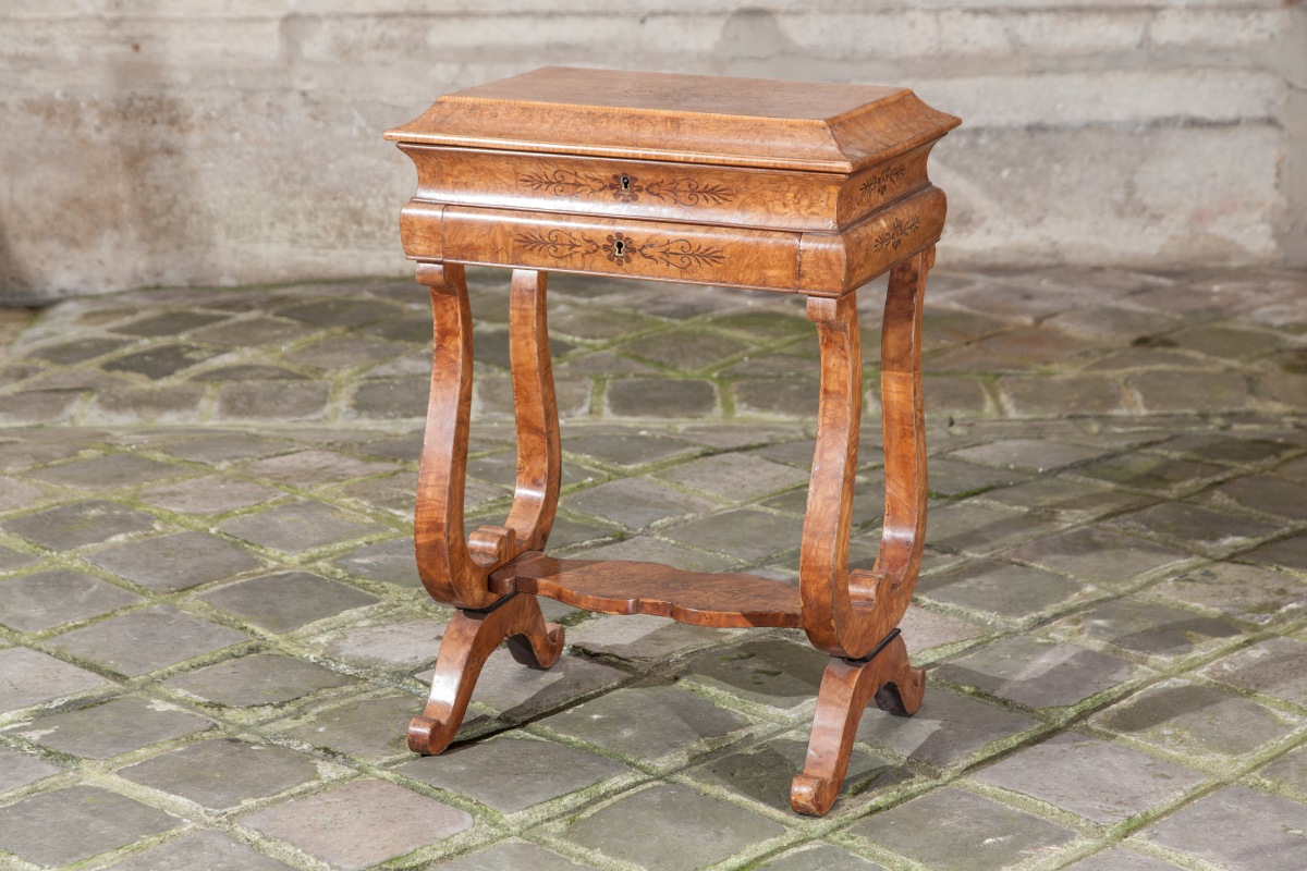 TABLE TRAVAILLEUSE en placage de loupe de frêne à décor incrusté en amarante de fleurons, palmettes et volutes. Plateau à doucine à miroir découvrant des casiers et un tiroir en ceinture. Montants en lyre ajourée sur deux patins et entretoise plate chantournée.