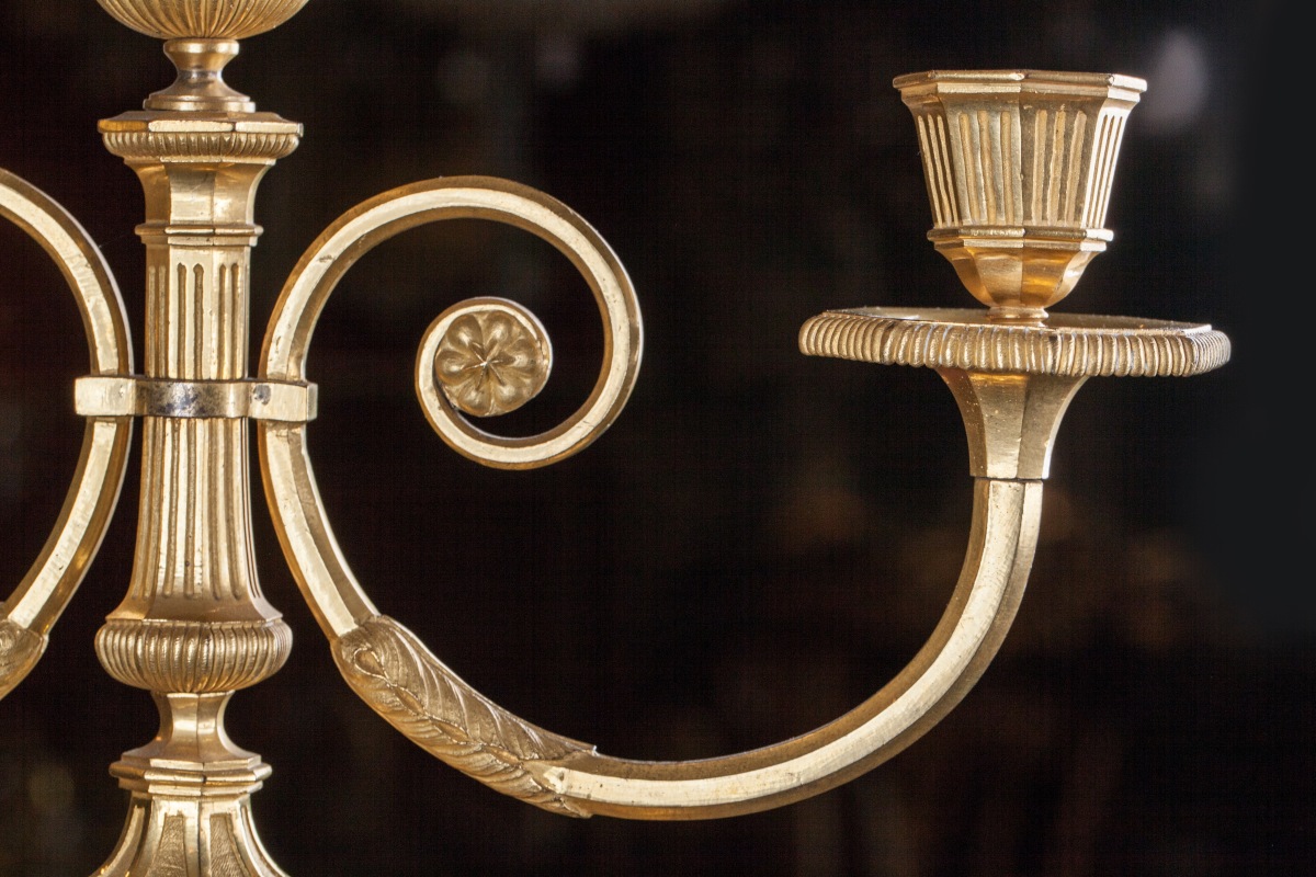 PAIRE de CANDÉLABRES en bronze doré à bouquet de deux lumières à volutes, feuillages et pots à feu. Binets, fûts et bases à pans cannelés.