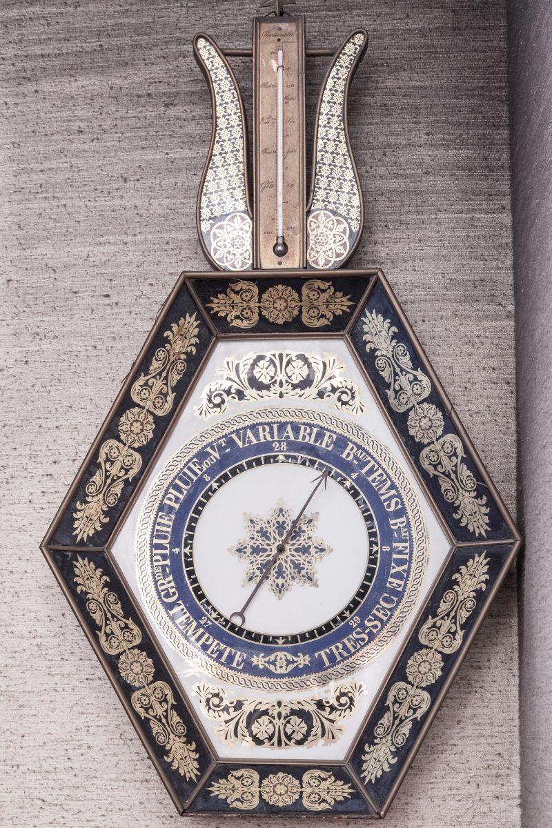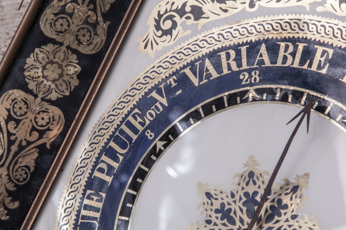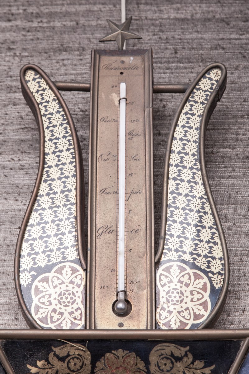 BAROMÈTRE-THERMOMÈTRE à mercure dans un encadrement hexagonal surmonté d'une lyre...