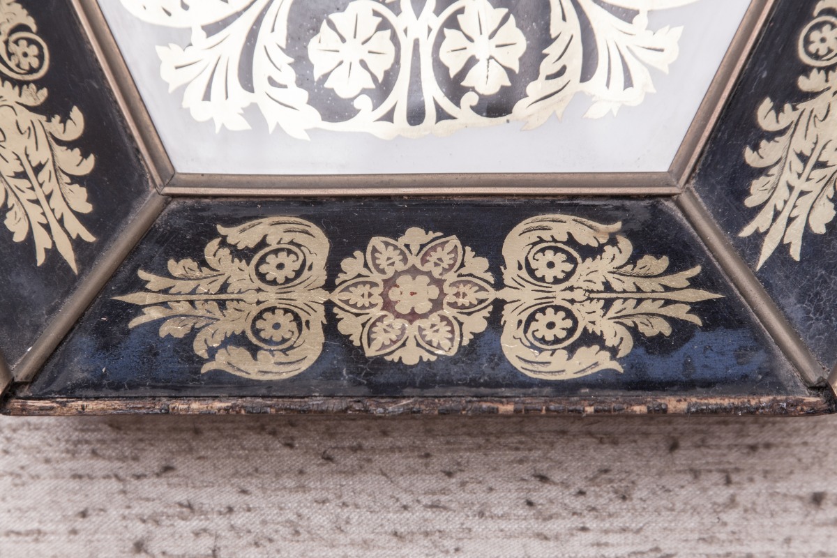 BAROMÈTRE-THERMOMÈTRE à mercure dans un encadrement hexagonal surmonté d'une lyre en verre églomisé et moulures de laiton à décor de palmettes et volutes feuillagées.