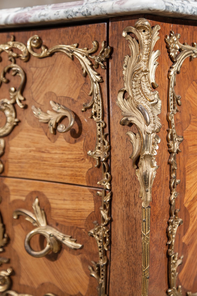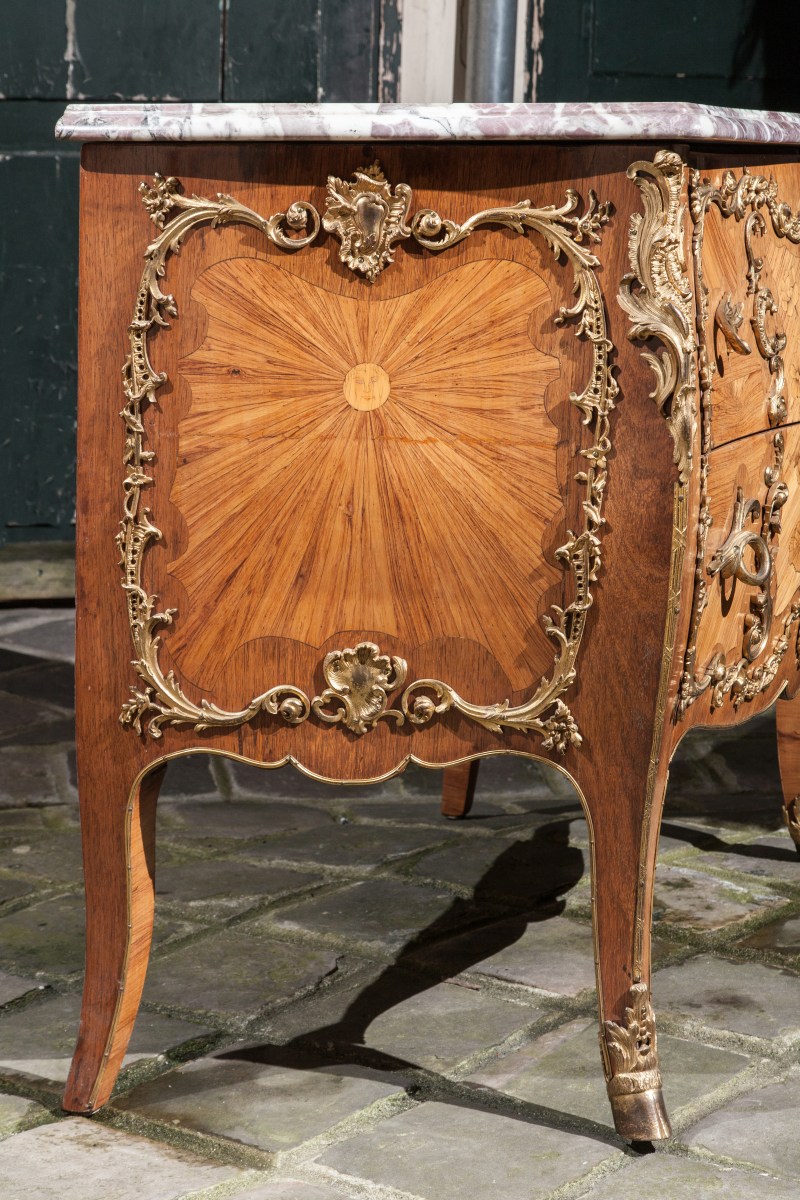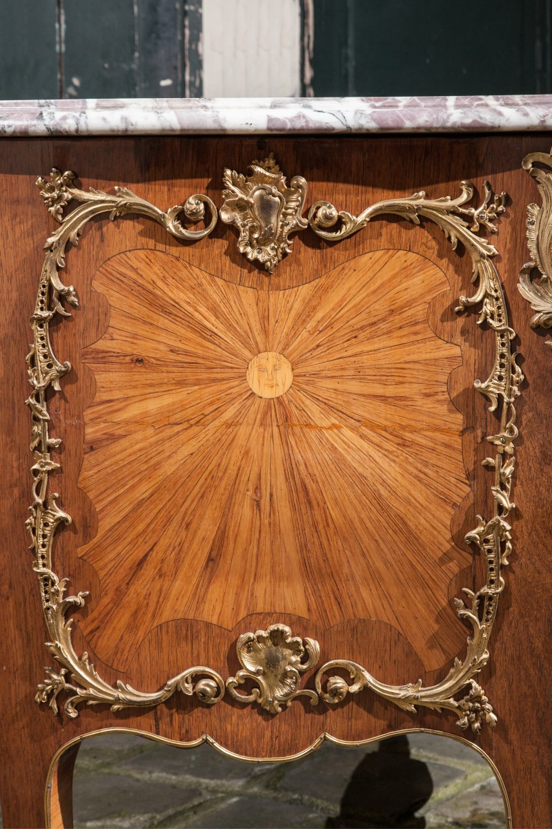 PAIRE de COMMODES à façades et côtés galbés en placage de bois de rose dans des encadrements mouvementés de bois de violette à décor marqueté de branches fleuries dans des réserves. Elles ouvrent à deux tiroirs sans traverse. Riche ornementation de bronzes rocaille ciselés dorés, marqués CP. Dessus de marbre fleur de pêcher.